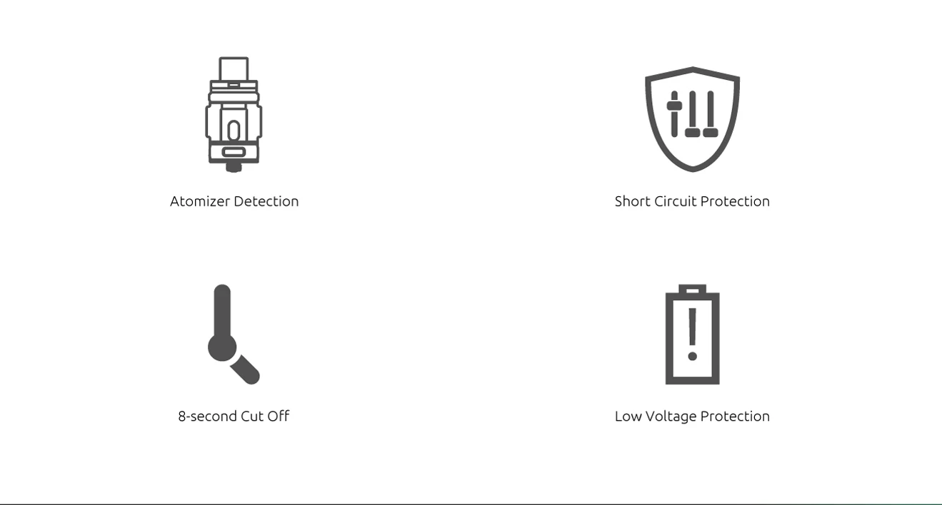 8. Multiples protections: détection d’atomiseur/court-Circuit/coupure de 8 secondes/Protection basse tension