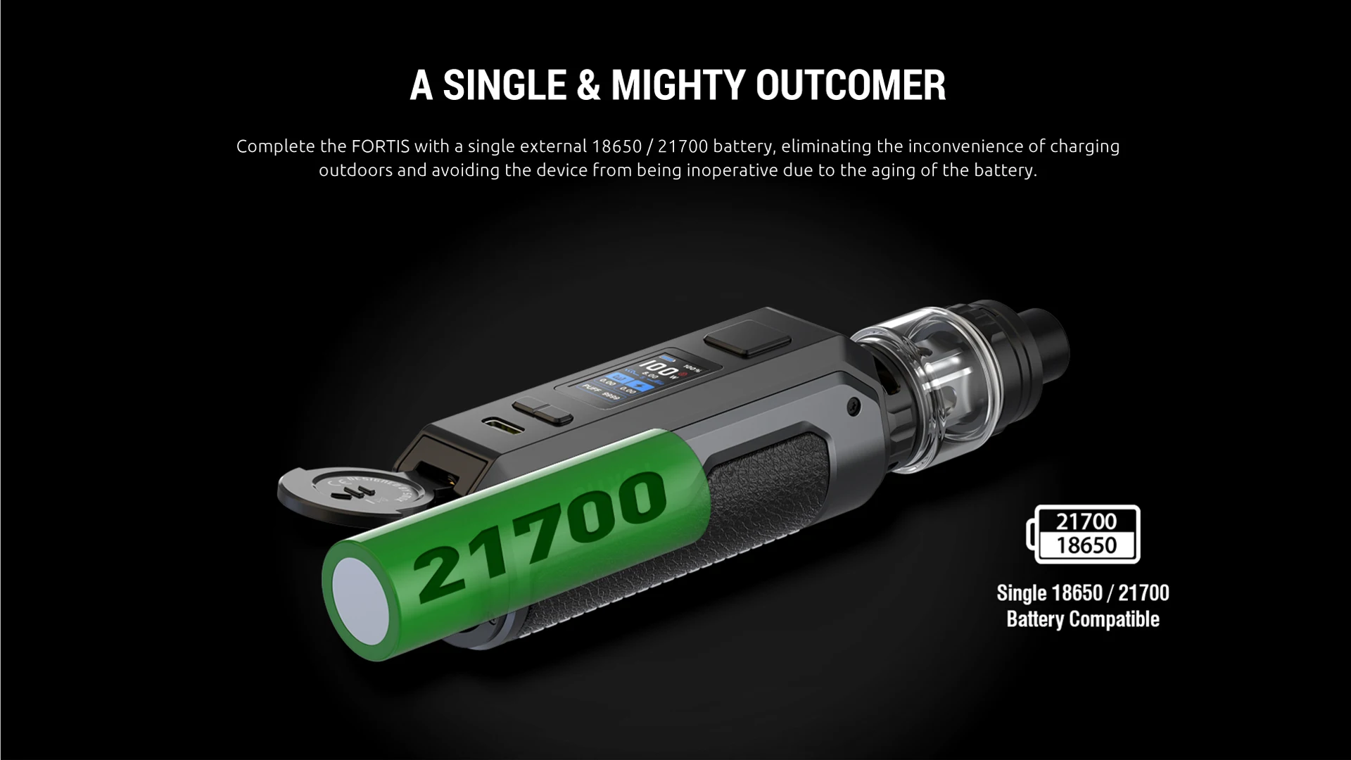 | Battery | Single external 18650 / 21700 battery |