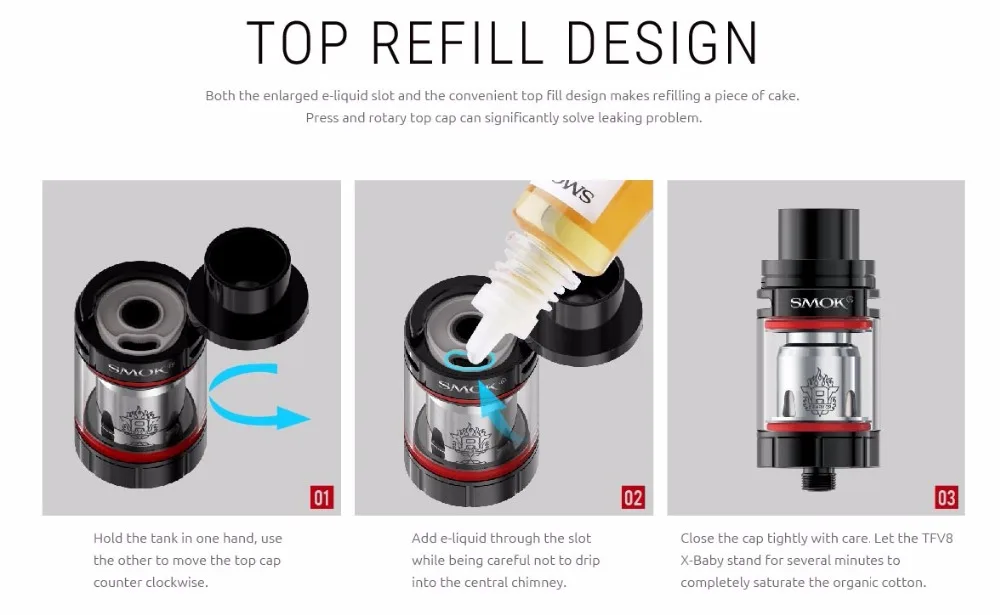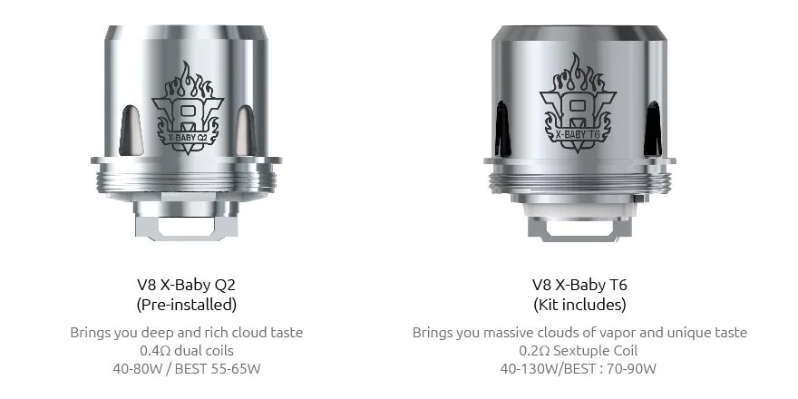 Le réservoir TFV8 x-baby est célèbre pour son système de flux d’air supérieur, combinant avec un noyau Q2 ou T6, vous pouvez profiter d’une vapeur massive et d’un flux d’air régulier.