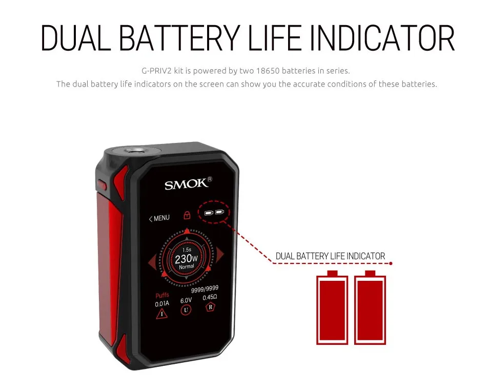 Alimenté par deux batteries 18650 en série, G-PRIV 3 peut atteindre une puissance maximale de 230W.