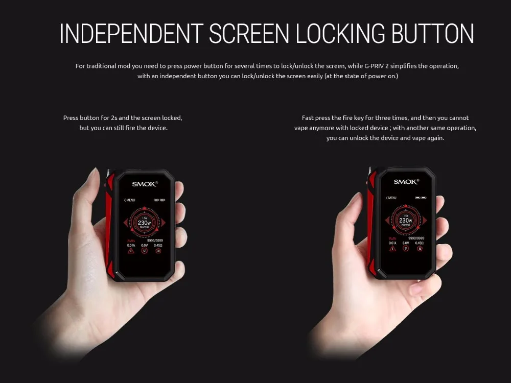 Pour certains mods traditionnels, il faut appuyer plusieurs fois sur la touche Fire pour verrouiller/déverrouiller l’écran, tandis que G-PRIV 3 simplifie