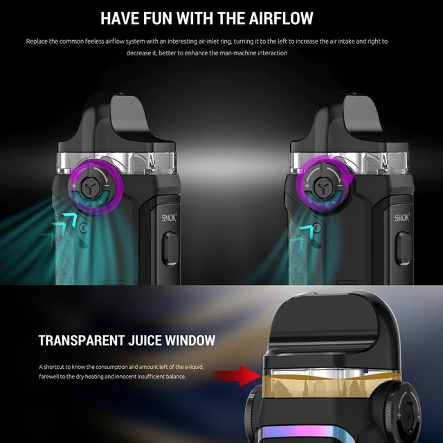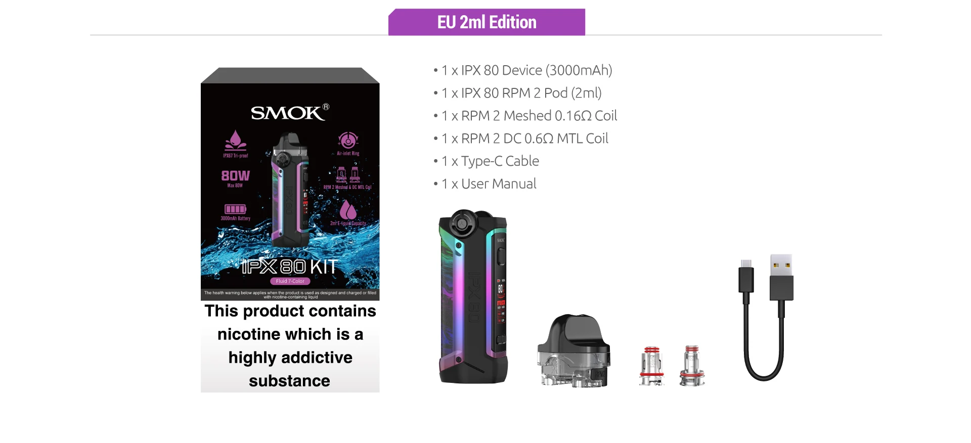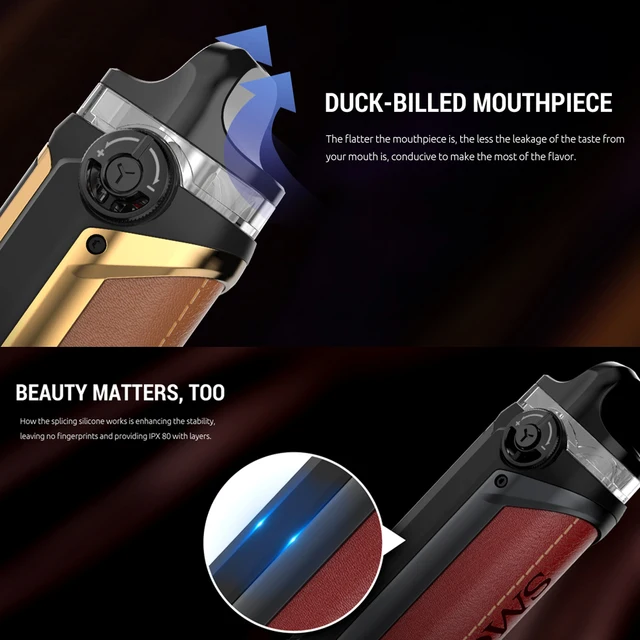 Le Kit PX 80 a une grande capacité de batterie de 3000mAh avec 80W max et dispose de IPX67 tri-proof (étanche à l’eau/à la poussière/aux chocs), c’est la raison pour laquelle il est appelé IPX 80. Avec une puissance réglable de 1-80W, il vous permet d’appuyer sur le bouton haut/bas pour obtenir la puissance adaptée à votre goût. Et vous pouvez obtenir les informations en temps réel de la vaporisation à partir de l’écran d’affichage de 0.96 pouces. Il a une vitesse de tir rapide de 0.001s et une charge de type c, ce qui rendra votre vapotage plus pratique. Votre appareil ne laissera aucune empreinte digitale et restera propre tout le temps avec l’épissure de silicone. Le Kit IPX 80 offre deux dosettes au choix: IPX 80 RPM 2 Pod et IPX 80 RPM Pod (vendus séparément), les deux ont une grande capacité de dosette de 5.5ml. Vous pouvez observer le niveau avec la conception de la fenêtre transparente. Il y a une bague d’entrée d’air pour obtenir différents flux d’air, vous pouvez le tourner vers la gauche pour augmenter l’entrée d’air et vers la droite pour le diminuer. La bobine RPM 2 Mesh 0,16 ohm et la bobine RPM 2 DC 0,6 ohm MTL sont incluses dans l’emballage. Des protections multiples assureront votre sécurité: batterie au Lithium/détection d’atomiseur/coupure 8s/court-Circuit/Protection basse tension.