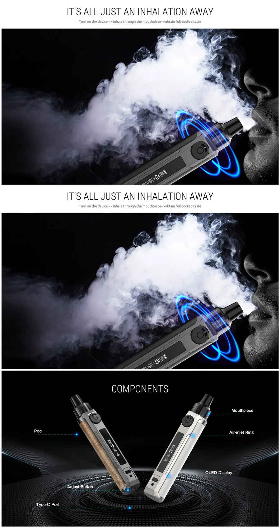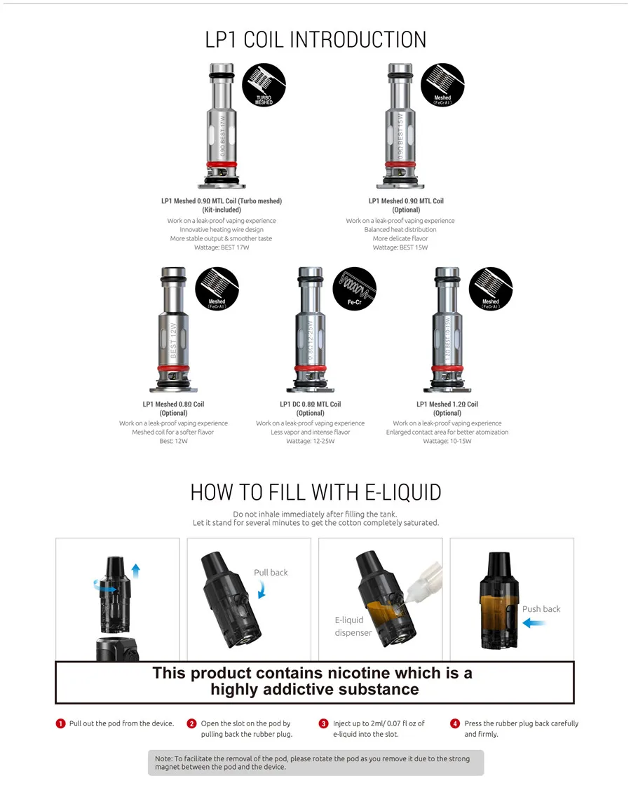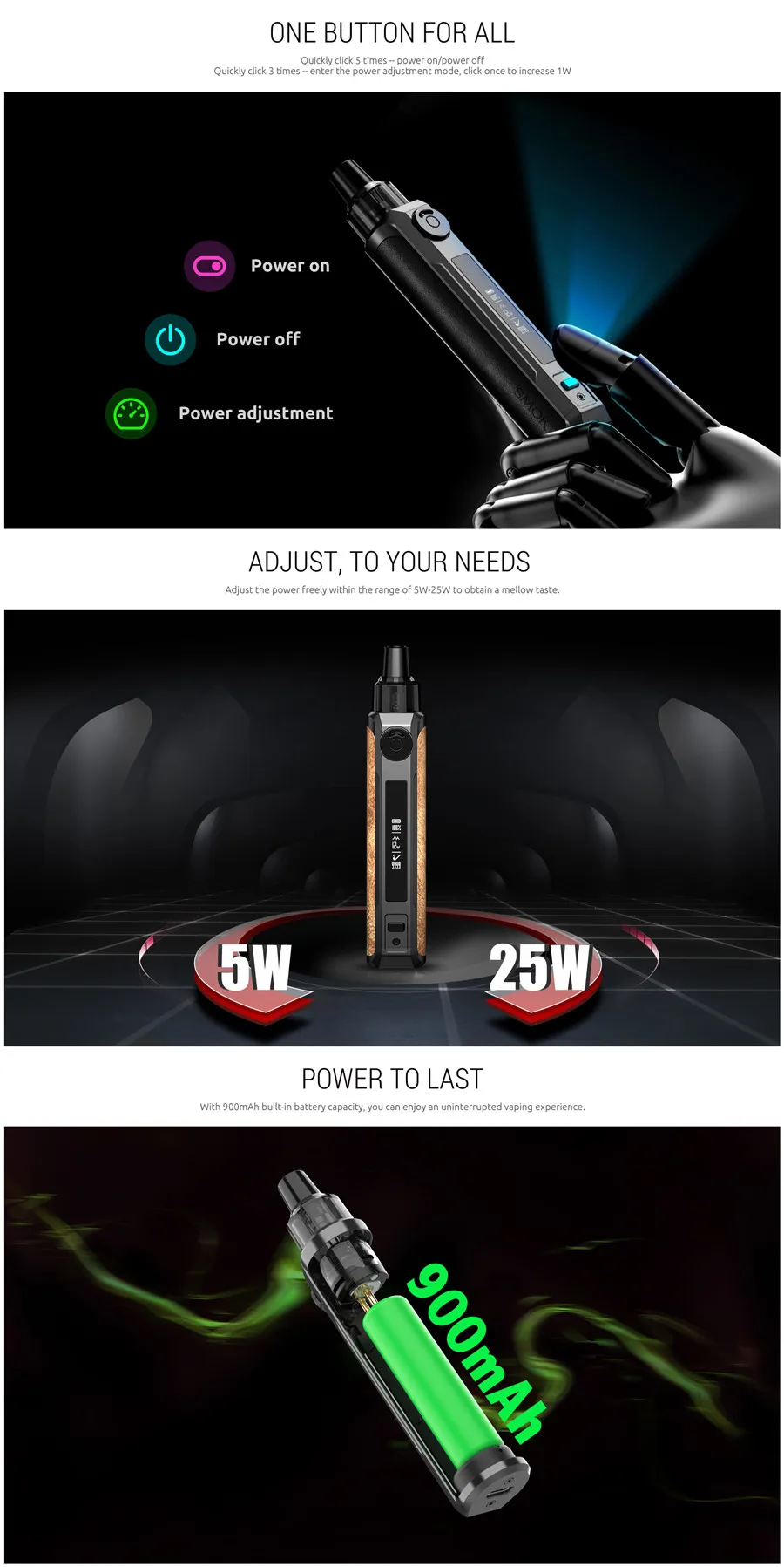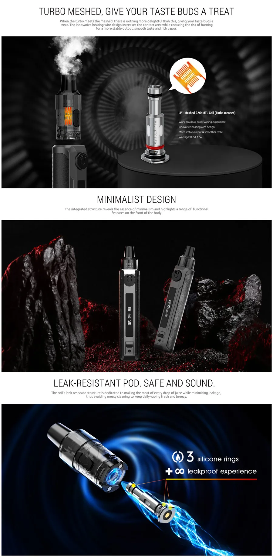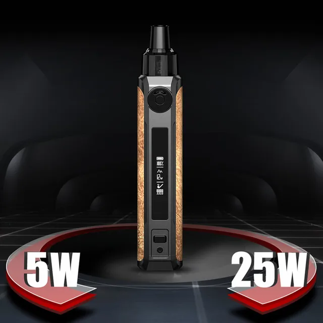 Le Kit RPM 25W est mince et compact dans la construction, délicat et élégant dans le style. Il est conçu avec une batterie de 900mAh et une plage de puissance réglable de 5W-25W. Il y a 3 anneaux en silicone sur les bobines, ce qui vous offrira une excellente expérience anti-fuite. La capsule peut contenir 2ml et peut être tournée à 360 degrés. Un écran OLED de 0.69 pouces est ajouté pour vous montrer les informations de vapotage. RPM 25W Pod Kit est compatible avec les bobines lp1.