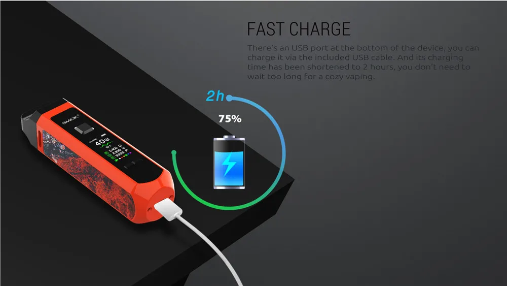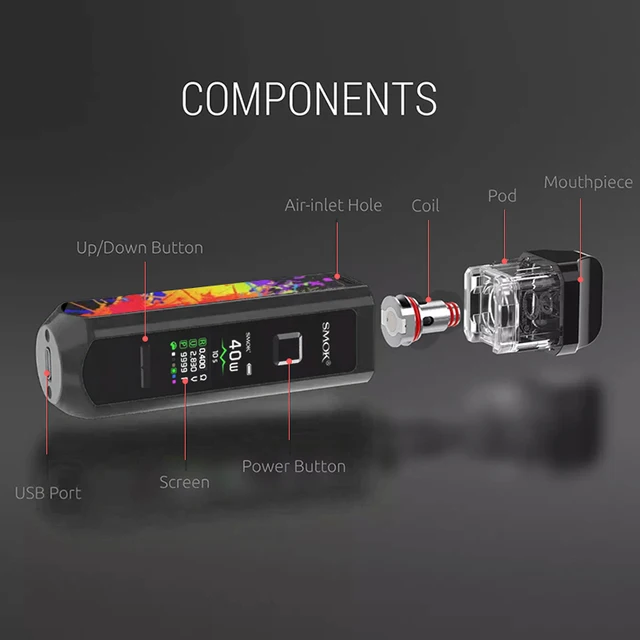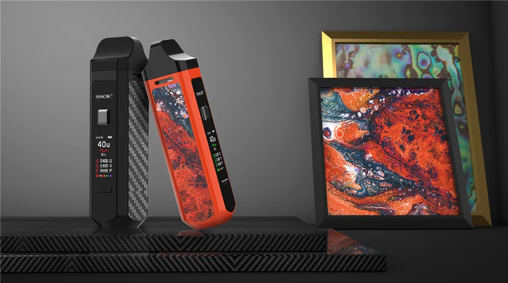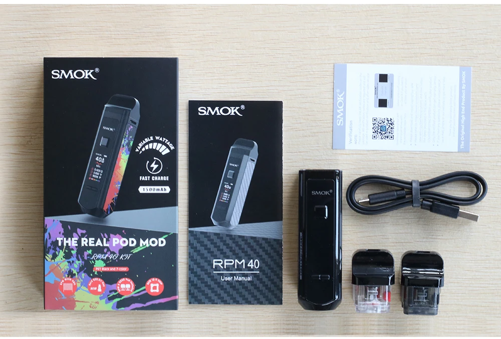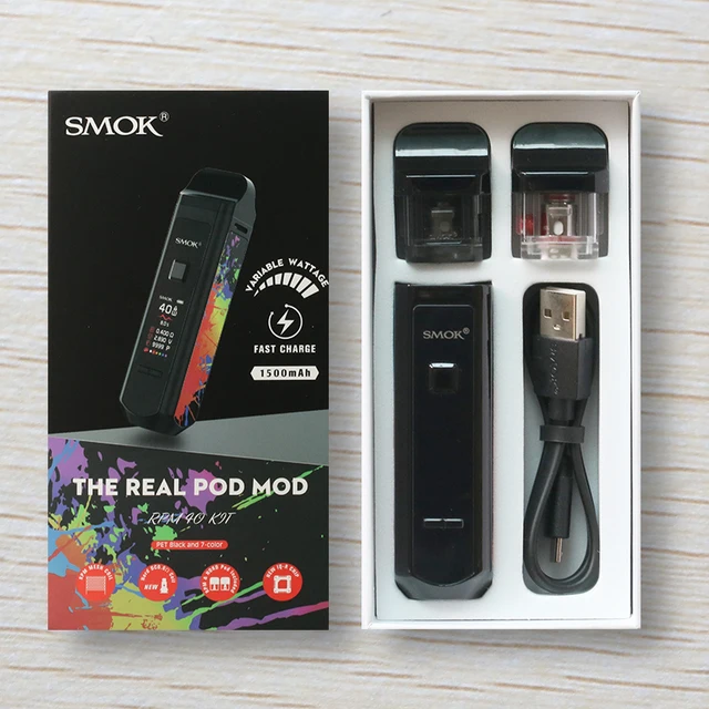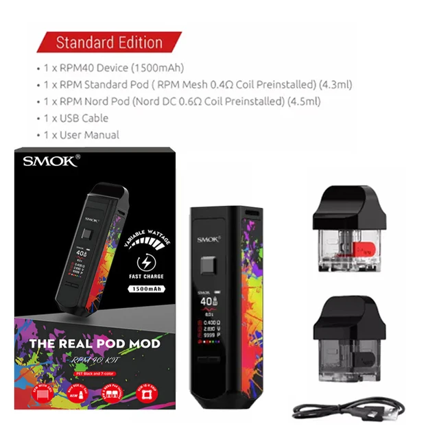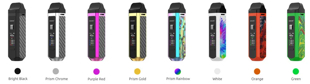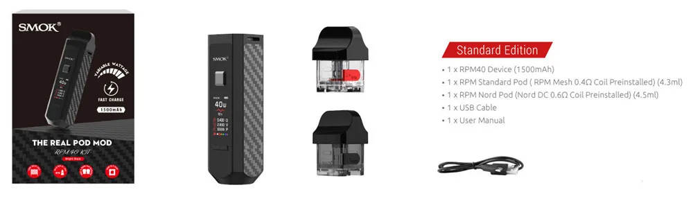 Le Kit de dosettes RPM40 de SMOK est un kit de dosettes ultra-portable qui combine les avantages des dispositifs de dosettes et des mods de boîte. Il est livré avec 3 types de capacité de jus électronique: 5ml (pod vide); 4.3ml (Pod Standard) et 4.5ml (Pod Nord). Avec une batterie intégrée de 1500mAh, il vous offre une vaporisation de longue durée et une charge de courte durée. En outre, pour répondre à votre demande de vapotage, il adopte une plage de puissance de sortie de 1W à 40W. Et son temps de tir peut être raccourci à seulement 0.001s. Il dispose de l’embout large, qui permet plus d’inhalation d’air, tout comme la pointe d’égouttage d’un mod box classique. Avec un écran de 0.96 pouces conçu, vous pouvez connaître clairement les données de vapotage, comme la puissance, la résistance, la tension, la couleur de l’écran, le nombre de bouffées et le niveau de la batterie. De plus, en utilisant la bobine PRM Mesh 0,4 ohm, il produira une saveur de vaporisation excellente et pure pour vous. Il existe de multiples protections, telles que: Protection contre les hautes températures, coupure de 8 secondes, Protection contre les courts-circuits et Protection basse tension, pour assurer votre sécurité. Maintenant disponible en 8 couleurs: noir brillant, blanc, prisme arc-en-ciel, Orange, prisme Chrome, prisme or, vert, violet rouge.