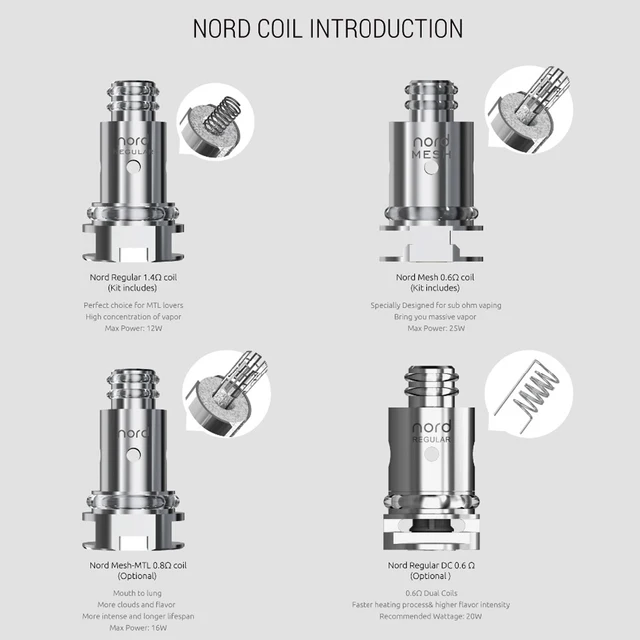 Le kit comprend la bobine Nord DC 0.8ohm MTL qui est construite avec des bobines doubles pour MTL vapotage. Cette tête présente une grande surface pour un chauffage rapide, des trous intérieurs de 2mm pour une saturation incroyable de la bobine, une vapeur énorme, une saveur de qualité et 16 watts de puissance. Les autres options de bobine Nord comprennent la bobine Mesh-MTL 0.8ohm (bouche à poumon, énorme vapeur, longévité, 16 watts de puissance), DC régulier 0.6ohm (chauffage rapide, saveur intense, 20W), Mesh-MTL 0.8ohm (bouche à poumon, énorme vapeur, saveur intense, longévité, 16 W), maille Nord 0.6ohm (vapotage sub ohm, vapeur massive), Et Nord 1,4 ohm (bouche à poumon, forte concentration de vapeur, bouche à poumon).