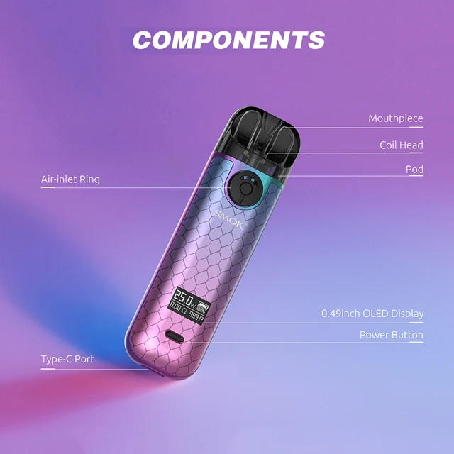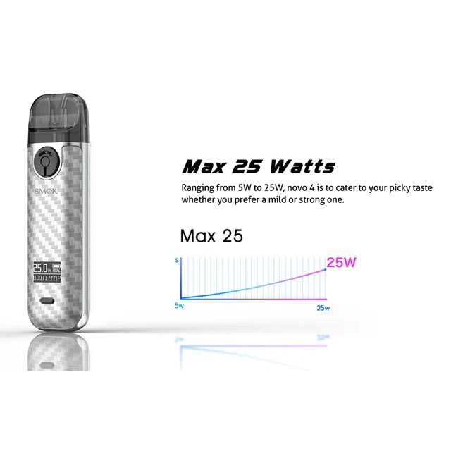 NOVO 4 Kit est la dernière promotion de la série NOVO. Avec des fonctionnalités polyvalentes, une apparence élégante et un style compact, le Kit SMOK NOVO 4 Pod offre un impact immédiat sur le système de pod traditionnel. Le Kit de système multifonctionnel NOVO 4 Pod comprend une batterie interne de 800mAh avec une puissance maximale de 25W. Vous pouvez tourner l’anneau d’entrée d’air pour choisir l’étanchéité de la saveur et l’épaisseur de la vapeur. Le bouton unique vous permet de régler la puissance en plusieurs clics. SMOK NOVO 4 est compatible avec 2ml NOVO 4 Pod et LP1 bobine maillée. Lorsque vous insérez la bobine dans le pod, l’anneau en silicone ajouté au bas de la bobine remplirait l’espace pour éviter les fuites.