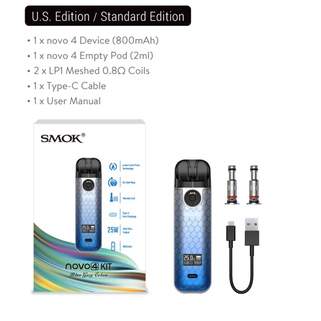 SMOK – Kit de cigarettes électroniques originales Novo 4, boîte de vapotage Mod, batterie 800mah, vporiseur 25W, cartouche 2ML, compatible avec bobine LP1
