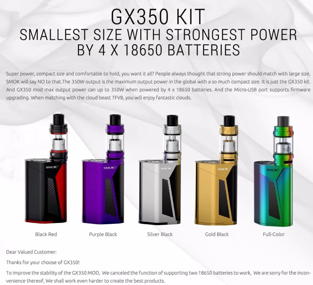 1 avis pour SMOK – Kit de démarreur de Cigarette électronique Original GX350, boîte Mod TFV8 Cloud, réservoir de 6ml, atomiseur T8 Q4 bobine Vape 350W VS Smok alien Kit