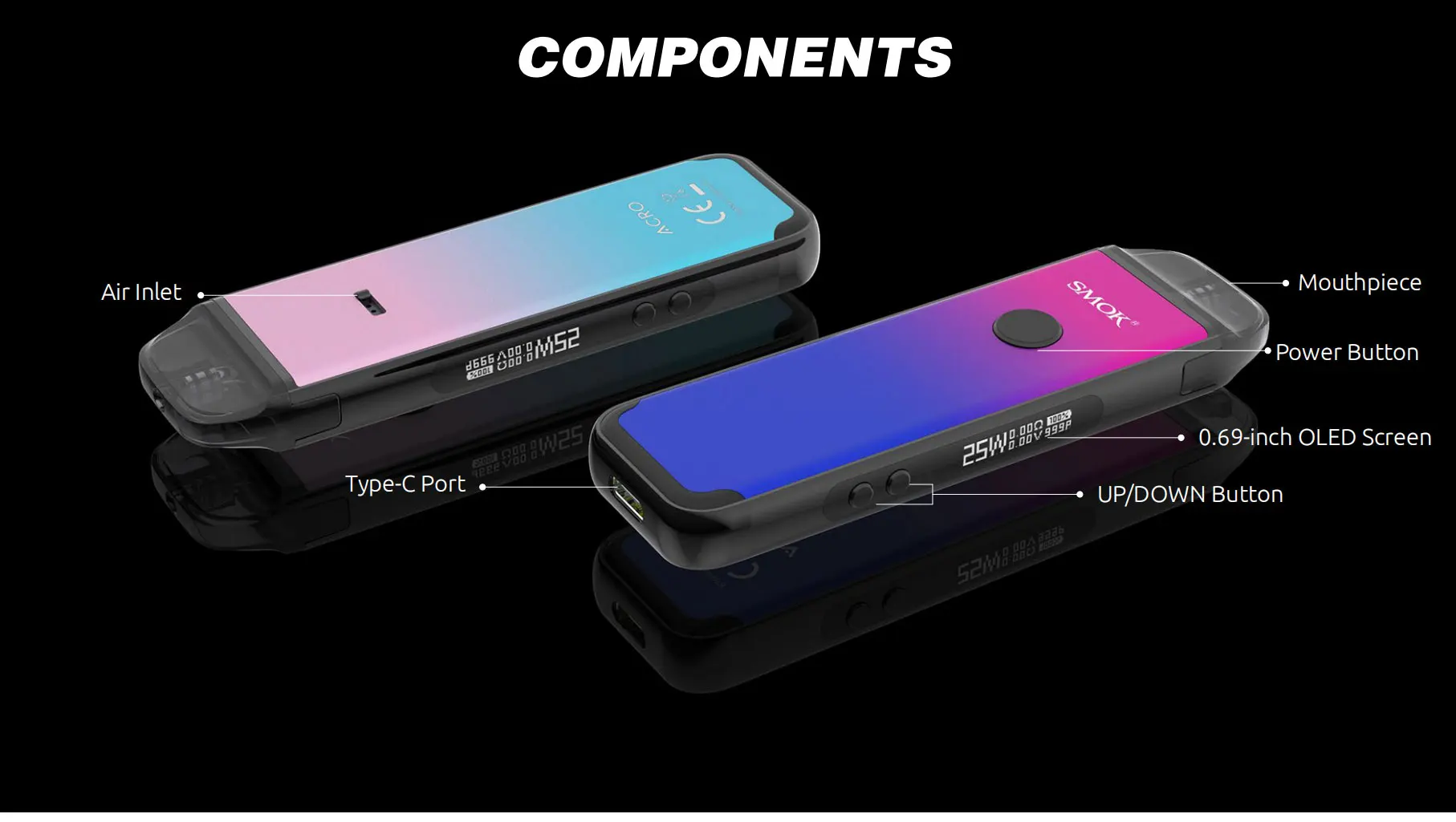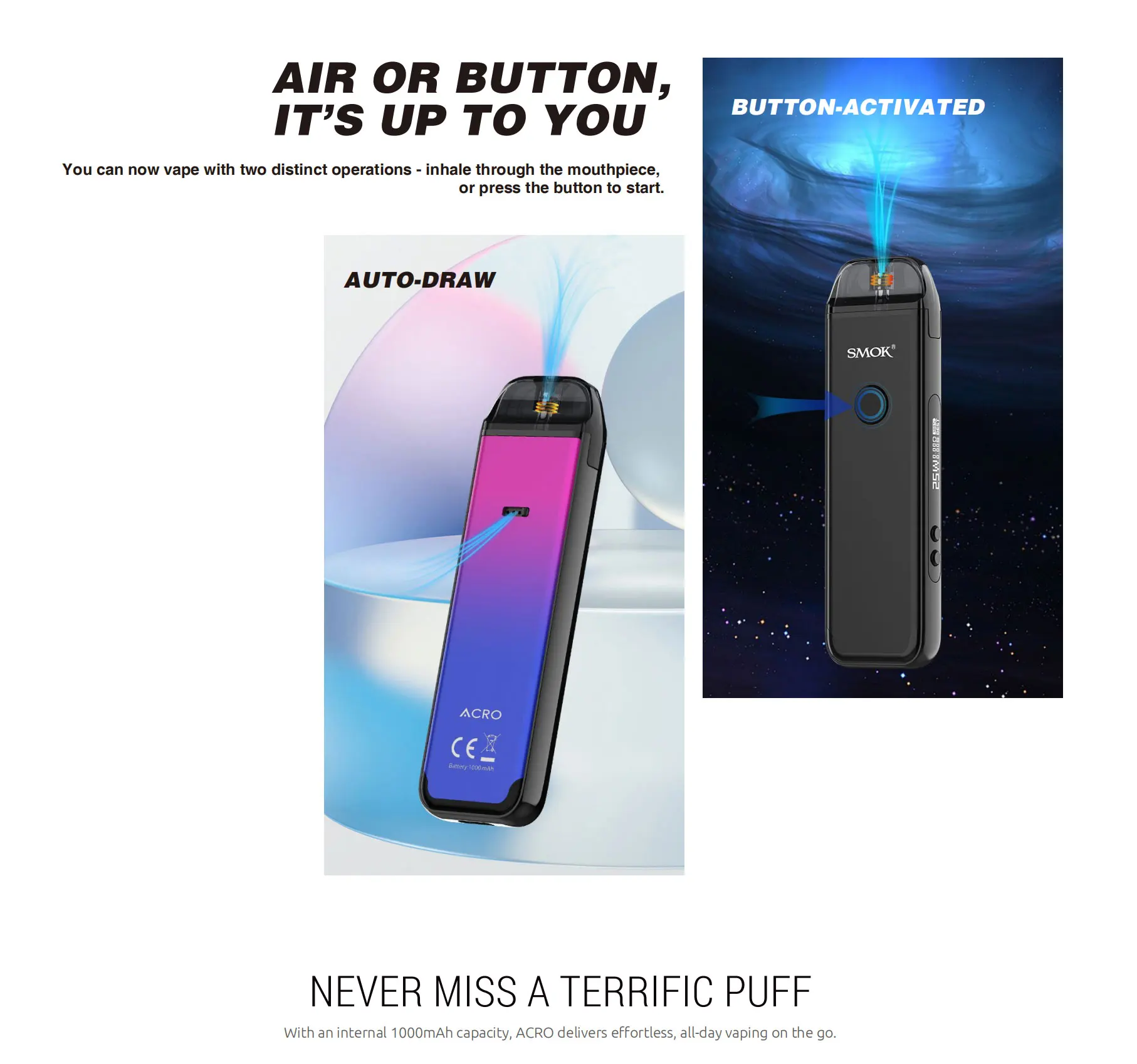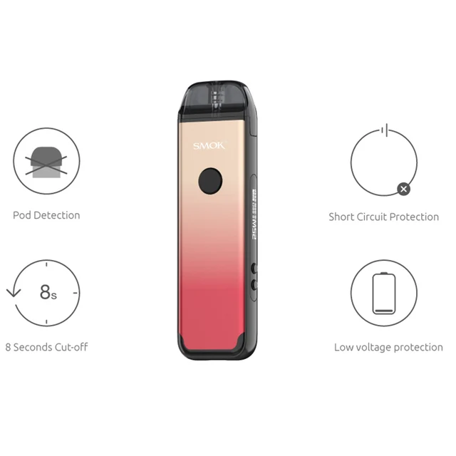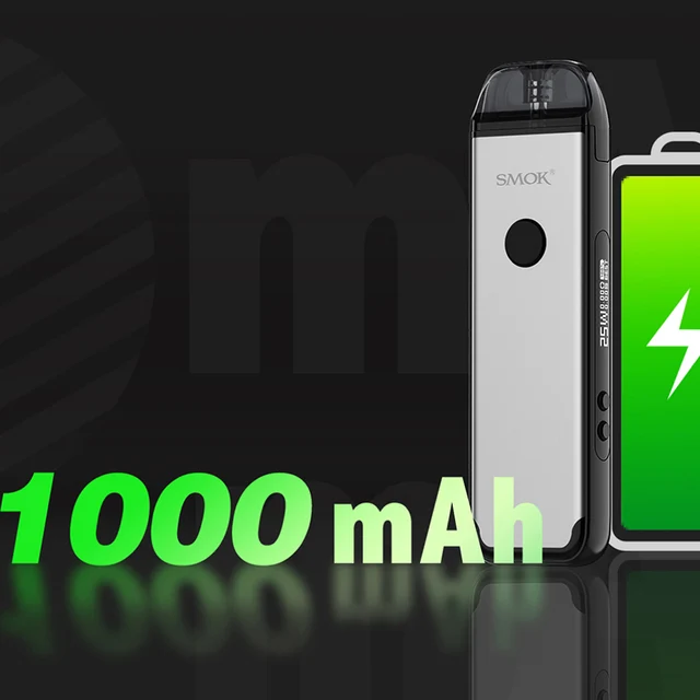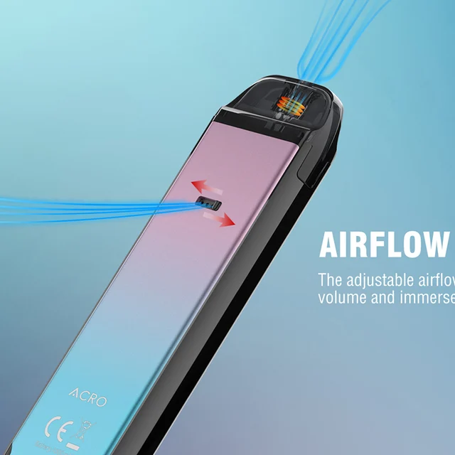 SMOK ACRO Pod Kit est alimenté par une batterie intégrée de 1000mAh avec une puissance maximale de 25W. SMOK ACRO Pod Kit 1000mAh combine le mode de démarrage automatique et activé par bouton. Le SMOK ACRO est votre système go-to pod pour vapoter toute la journée que vous pouvez facilement recharger via le port type-c situé au bas de l’appareil. L’appareil dispose d’un bouton de tir rond à l’avant, d’une entrée d’air à l’arrière, d’un écran OLED de 0.69 pouces sur le côté étroit et de deux boutons de réglage. SMOK ACRO pod est livré avec un pod maillé de 0,8 ohm avec un design de remplissage latéral.