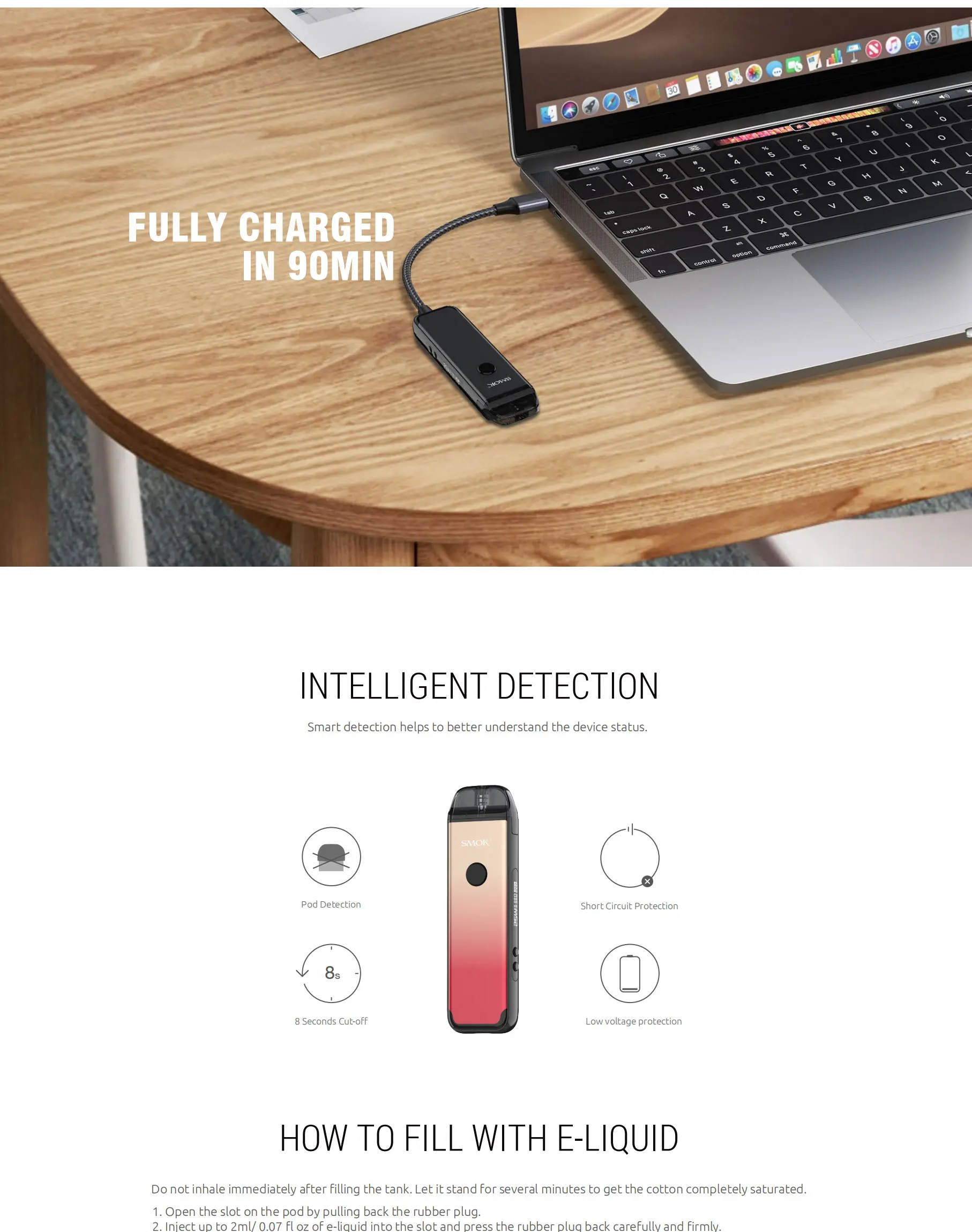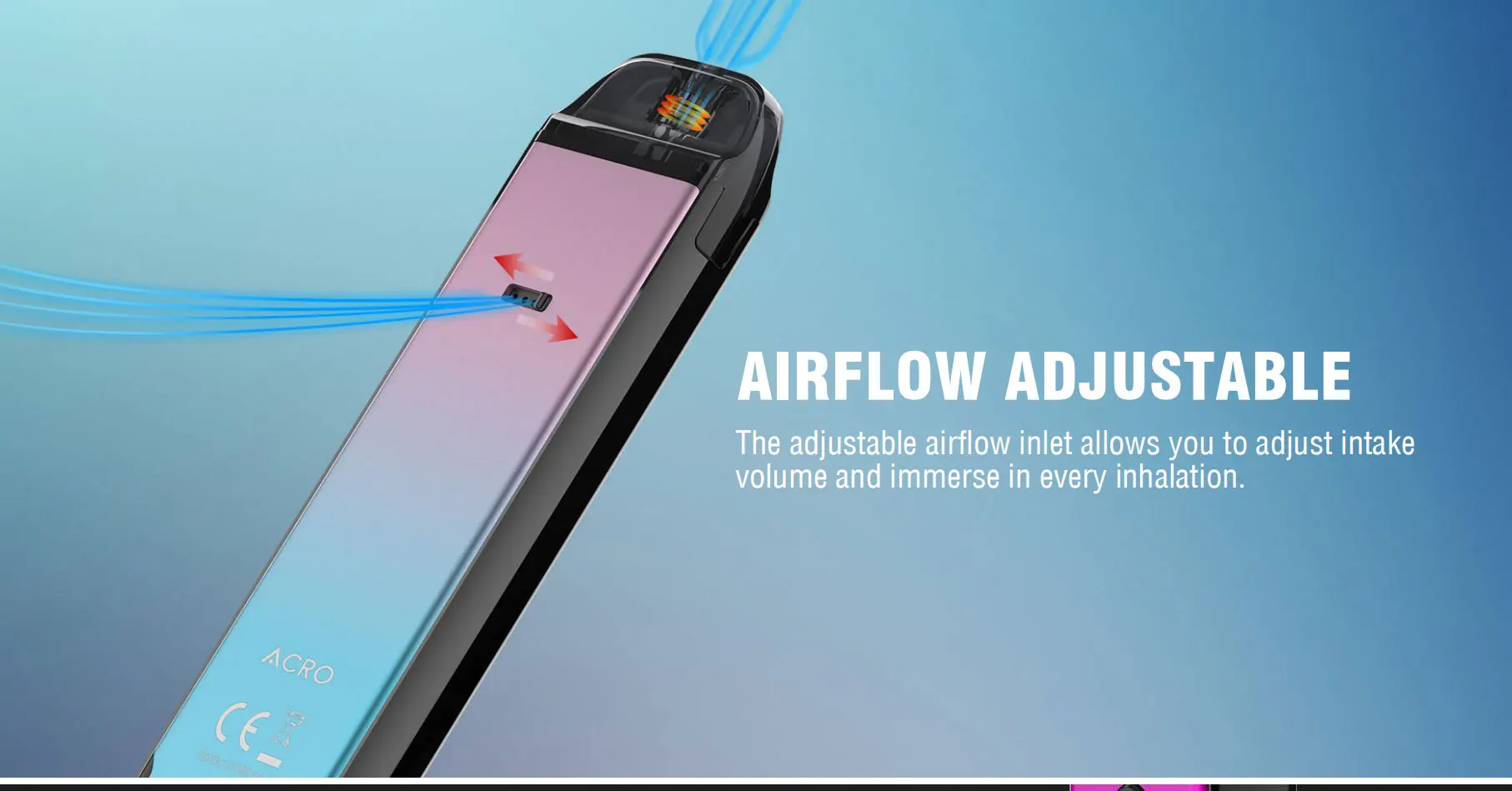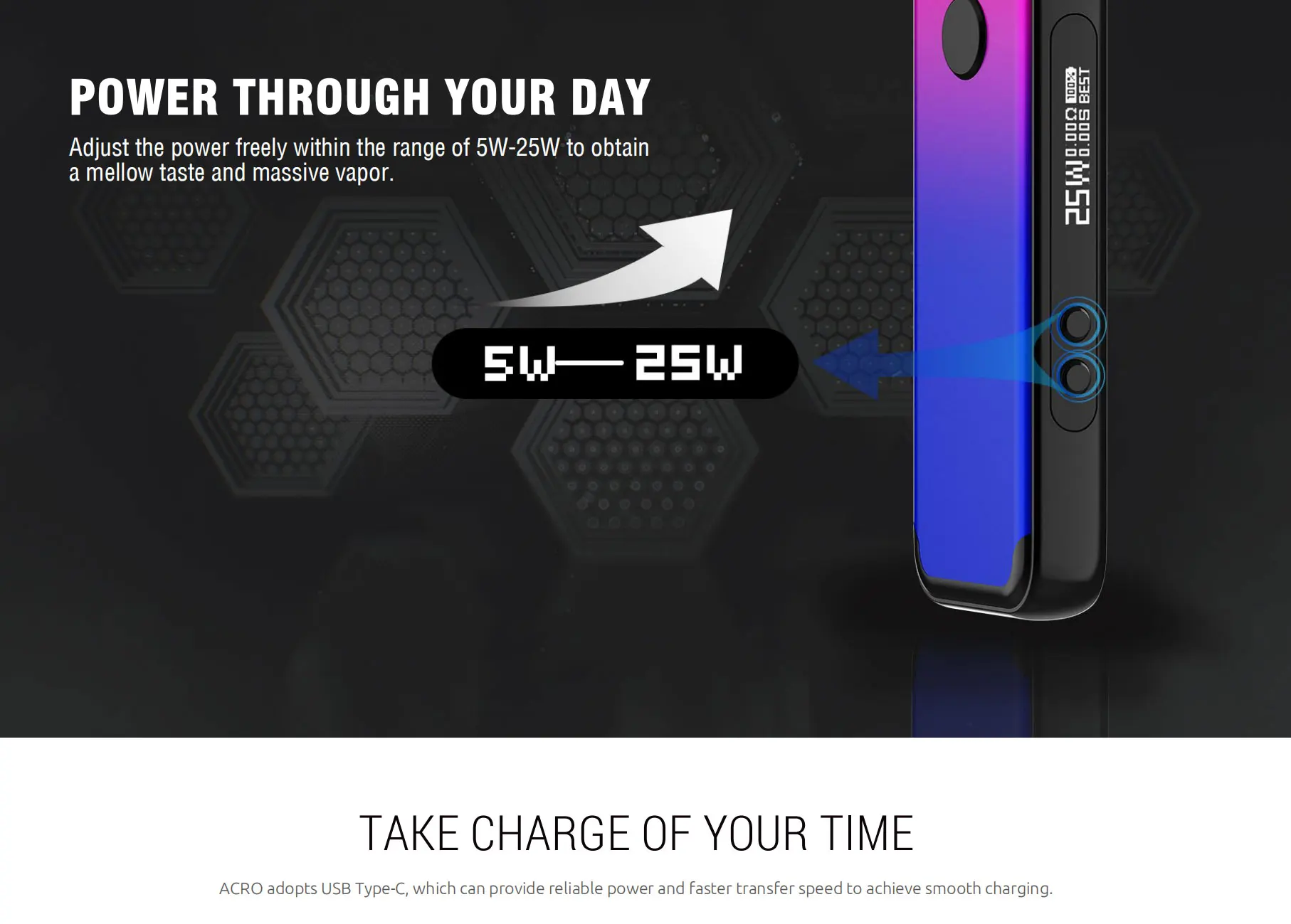 SMOK ACRO Pod Kit est alimenté par une batterie intégrée de 1000mAh avec une puissance maximale de 25W. SMOK ACRO Pod Kit 1000mAh combine le mode de démarrage automatique et activé par bouton. Le SMOK ACRO est votre système go-to pod pour vapoter toute la journée que vous pouvez facilement recharger via le port type-c situé au bas de l’appareil. L’appareil dispose d’un bouton de tir rond à l’avant, d’une entrée d’air à l’arrière, d’un écran OLED de 0.69 pouces sur le côté étroit et de deux boutons de réglage. SMOK ACRO pod est livré avec un pod maillé de 0,8 ohm avec un design de remplissage latéral.