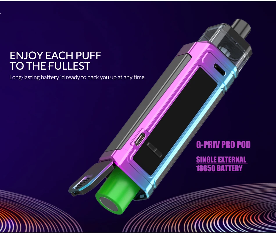 SMOK G-PRIV Pod a été amélioré sous le design classique de G-PRIV, qui est plus léger et plus petit, mais puissant. La série pod mod G-PRIV offre un plaisir accru avec des fonctionnalités enrichissantes, des contours attrayants et une expérience de vapotage immersive. G-PRIV POD avec compact, élégant et élégant, design simpliste et revêtement mat exquis, son aspect élégant offre un toucher lisse et confortable à vos mains. Kit de dosettes G-PRIV avec batterie longue durée de 2500mAh qui est prête à vous soutenir à tout moment. Et le Kit POD G-PRIV PRO est alimenté par une seule batterie externe 18650, les deux peuvent atteindre une sortie entre 5-80W de puissance. La charge rapide de Type C produisant un courant de charge allant jusqu’à 1,4 a permet de profiter facilement de délicieuses bouffées. La clé de tir en fait une grande ergonomique qui est parfaite pour appuyer sans souci avec vos doigts: et votre paume. Prenez vapotage au niveau pro avec la puce polyvalente IQ-S et obtenez des performances impressionnantes avec un temps de tir aussi rapide que 0.001s. La taille de l’écran est parfaitement intégrée dans le corps, ce qui le rend plus grand et meilleur à utiliser.