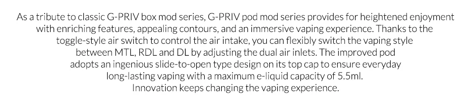 Quant à la cartouche de dosette de G-PRIV, elle est livrée avec l’interrupteur d’air à bascule pour contrôler l’entrée d’air, vous pouvez basculer de manière flexible le style de vapotage entre MTL, RDL et DL en réglant les deux entrées d’air. Profitez de chaque bouffée et plongez-vous dans une vapeur massive et une saveur douce grâce à deux entrées d’air ajustées par un interrupteur à bascule, vous permettant de prendre un nouveau tour sur votre vie de vapotage. Les bobines de la série LP2 mesh apporteront une toute nouvelle expérience de vapotage, et le POD G-PRIV Pro est compatible avec la série de bobines RPM 2. Lors de l’insertion de la bobine dans le pod, l’anneau en silicone ajouté au bas de la bobine remplirait l’espace, calibrer efficacement le liquide qui fuit de la capsule, ce qui entraîne une expérience de vapotage salissante des mains sales. La capacité de 5ml en utilisant la méthode de remplissage coulissant à ouvert rend le remplissage aussi facile que la tarte sans retirer le dosette pour le remplir tout en maintenant un processus de remplissage hygiénique.
