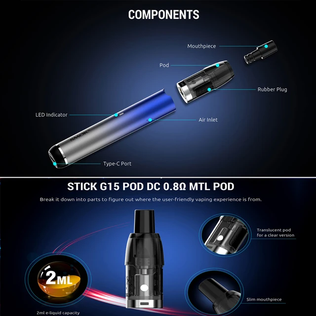 Smok STICK G15 Pod Kit 15W 700mAh batterie intégrée 2ml Cigarette électronique vaporisateur MTL type-c Kit de stylo Vape Portable