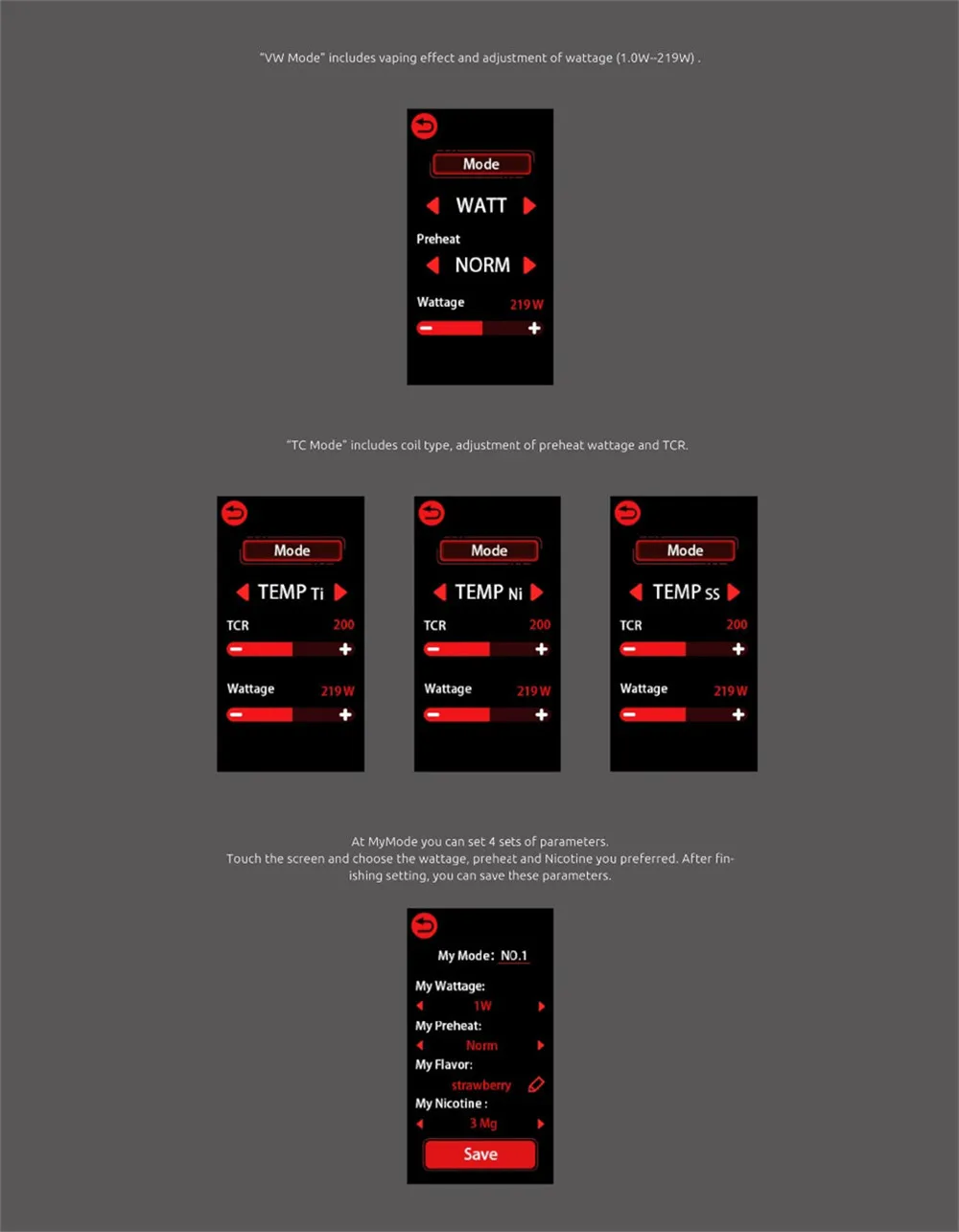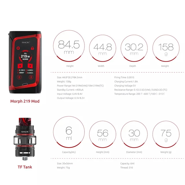 Sa puissance de sortie maximale est de 219W, facile à satisfaire les chasseurs de cloud. Le réservoir TF2019 est inclus dans ce kit, avec une capacité de 6ml d’e-liquide et deux bobines puissantes, il fournira la meilleure saveur et nuage.