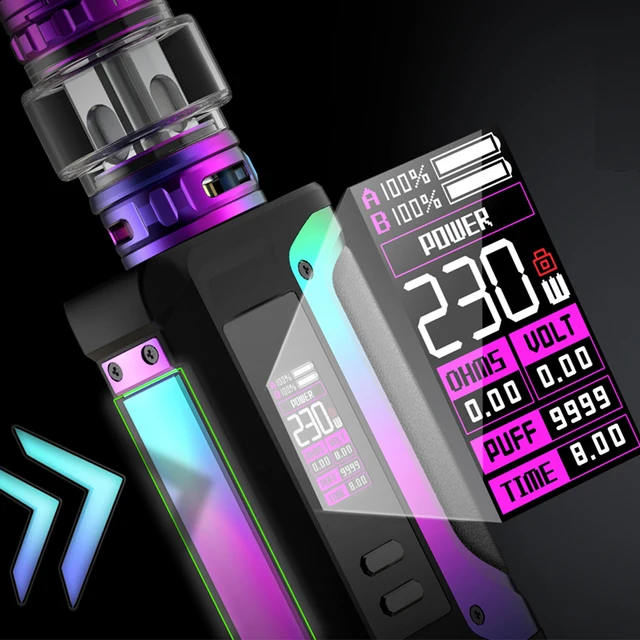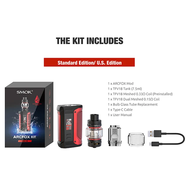 Le Kit d’arcfox contient le Mod de boîte d’arcfox et le réservoir tfv18. Le Mod Arcfox est un mod box tri-proof qui est alimenté par deux batteries 18650 avec une plage de puissance de 5-230W. Avec une grande clé de feu et un écran TFT de 0.96 pouces convivial, il peut vous fournir une utilisation pratique d’une seule main et une expérience de vapotage très efficace. Le mod supporte le mode VW (5W-230W) et le mode TC (10W-80W), et vous pouvez ajuster la résistance actuelle, puissance et tension pour obtenir un contrôle précis de la puissance et de la température. Adoptant un excellent jeu de puces et un port de charge rapide de type c 2A, le Kit Arcfox vous offrira une vaporisation sûre, fiable et agréable. Le réservoir TFV18 a une grande capacité de réservoir de 7.5ml et dispose de 5 attelles sur la base pour transférer efficacement l’alimentation à la bobine pour un chauffage circulaire et rapide. Il est compatible avec les bobines TFV18 et deux bobines à mailles TFV18 sont incluses dans l’emballage.