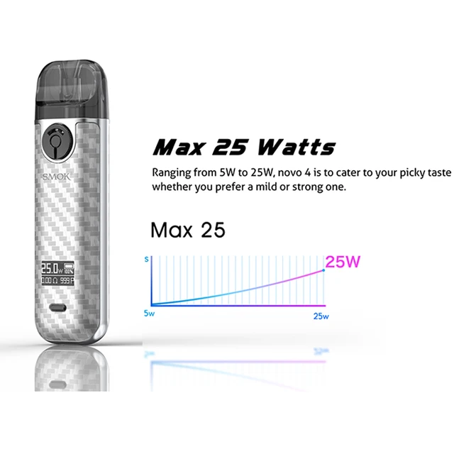 NOVO 4 Kit est la dernière promotion de la série NOVO. Avec des fonctionnalités polyvalentes, une apparence élégante et un style compact, le Kit SMOK NOVO 4 Pod offre un impact immédiat sur le système de pod traditionnel. Le Kit de système multifonctionnel NOVO 4 Pod comprend une batterie interne de 800mAh avec une puissance maximale de 25W. Vous pouvez tourner l’anneau d’entrée d’air pour choisir l’étanchéité de la saveur et l’épaisseur de la vapeur. Le bouton unique vous permet de régler la puissance en plusieurs clics. SMOK NOVO 4 est compatible avec 2ml NOVO 4 Pod et LP1 bobine maillée. Lorsque vous insérez la bobine dans le pod, l’anneau en silicone ajouté au bas de la bobine remplirait l’espace pour éviter les fuites.