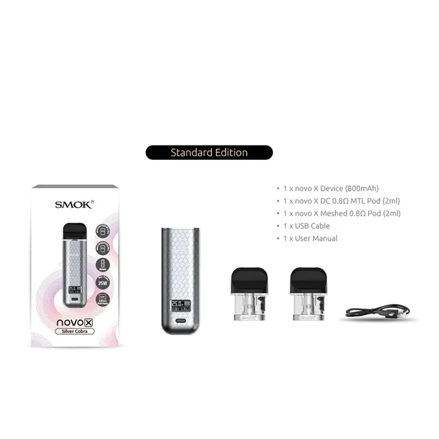 La série novo à part entière présente un autre nouveau membre, le novo X, qui est un système de dosette élégant et ergonomique alimenté par une batterie de 800mAh. Il a une plage de puissance réglable de 1-25 watts, et utilise deux cosses de 2ml: une double bobine 0.8ohmpod et une cosse simple maille 0.8ohm, vous permettant de profiter du vapotage MTL de haut niveau avec un coup de gorge satisfaisant. Le novo X adopte un petit bouton d’alimentation et un écran OLED pour présenter un look frais et offrir plus de possibilités à explorer. L’innovation ne cesse de changer l’expérience de vapotage.