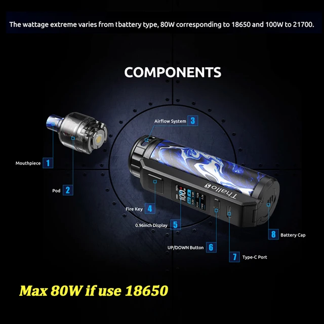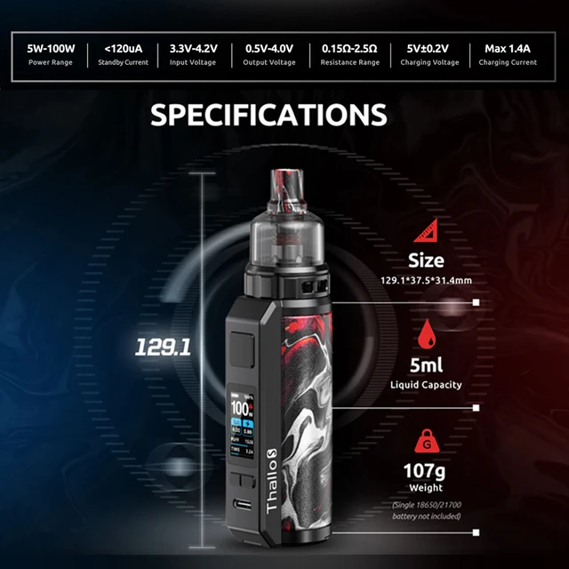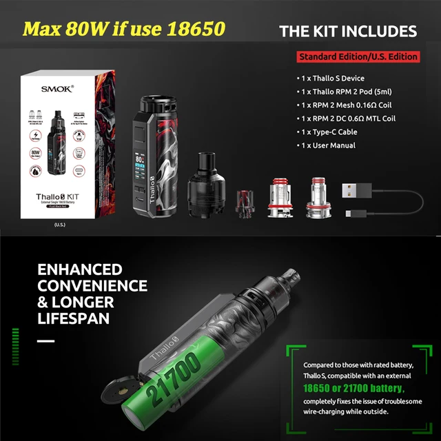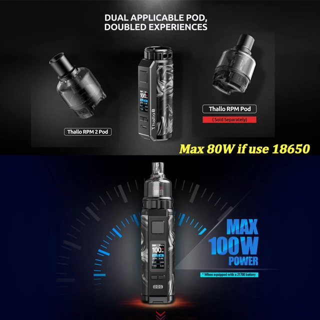 Thallo S conduit la puissance maximale à 100W, plus précis avec vos besoins pour un coup de gorge plus fort et des nuages plus denses. Étendre le type de batterie compatible aux deuxExterne 18650 et 21700, Il est plus facile à compléter que la conception individuelle et durable que la puissance nominale. Deux bobines incluses, variant dans la structure et le groupe cible, sont conçues pour enrichir la diversité du goût. L’innovation ne cesse de changer l’expérience de vapotage!