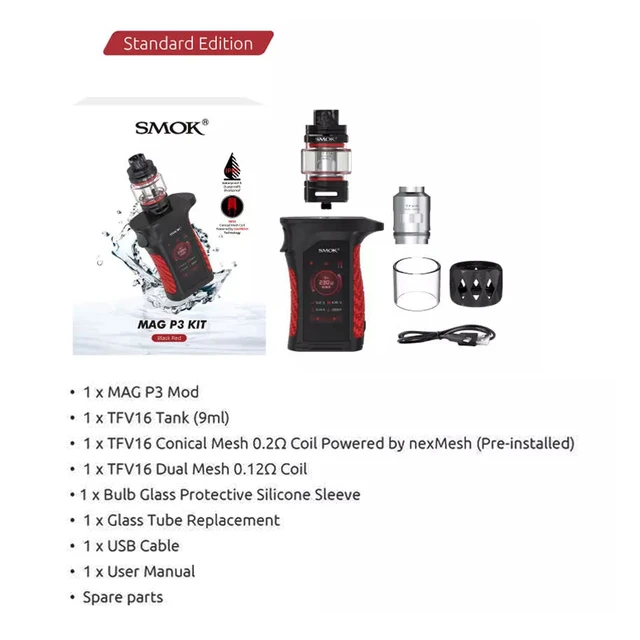 Résistant aux chocs. Il comprend un mod MAG P3 robuste et un remarquable réservoir TFV16 de 9ml, préinstallé avec un nouveau
