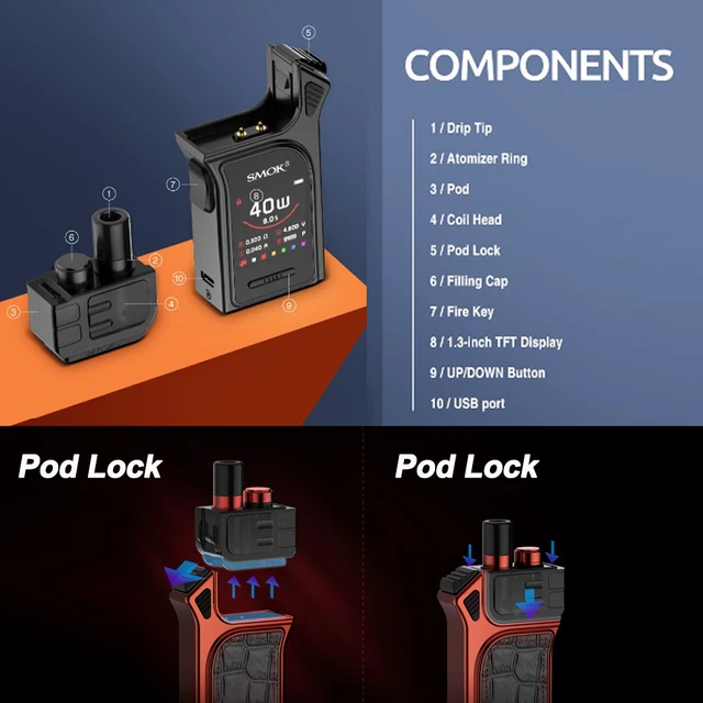 Adopter un bouton de verrouillage pour fixer le pod pour des raisons de sécurité. Ainsi, vous pouvez facilement réaliser le retrait du pod en appuyant sur ce bouton de verrouillage.
