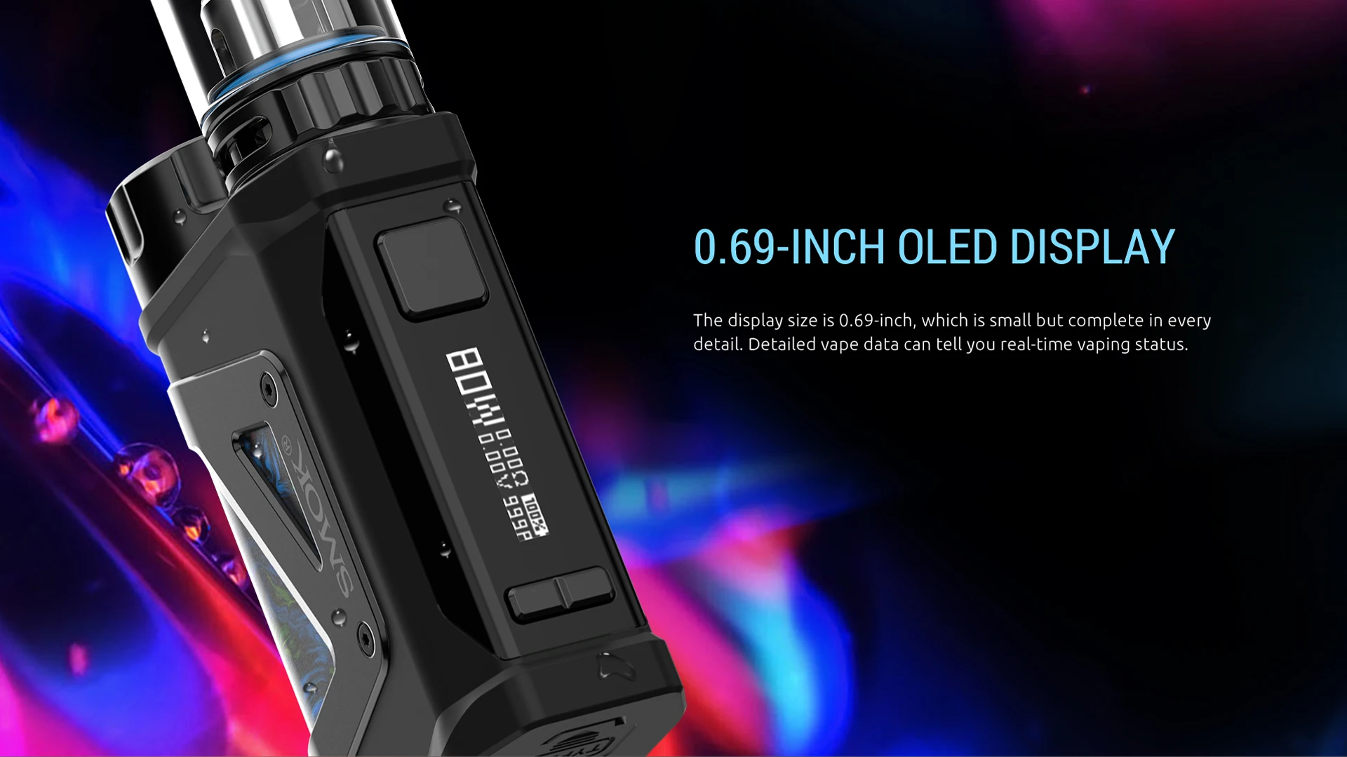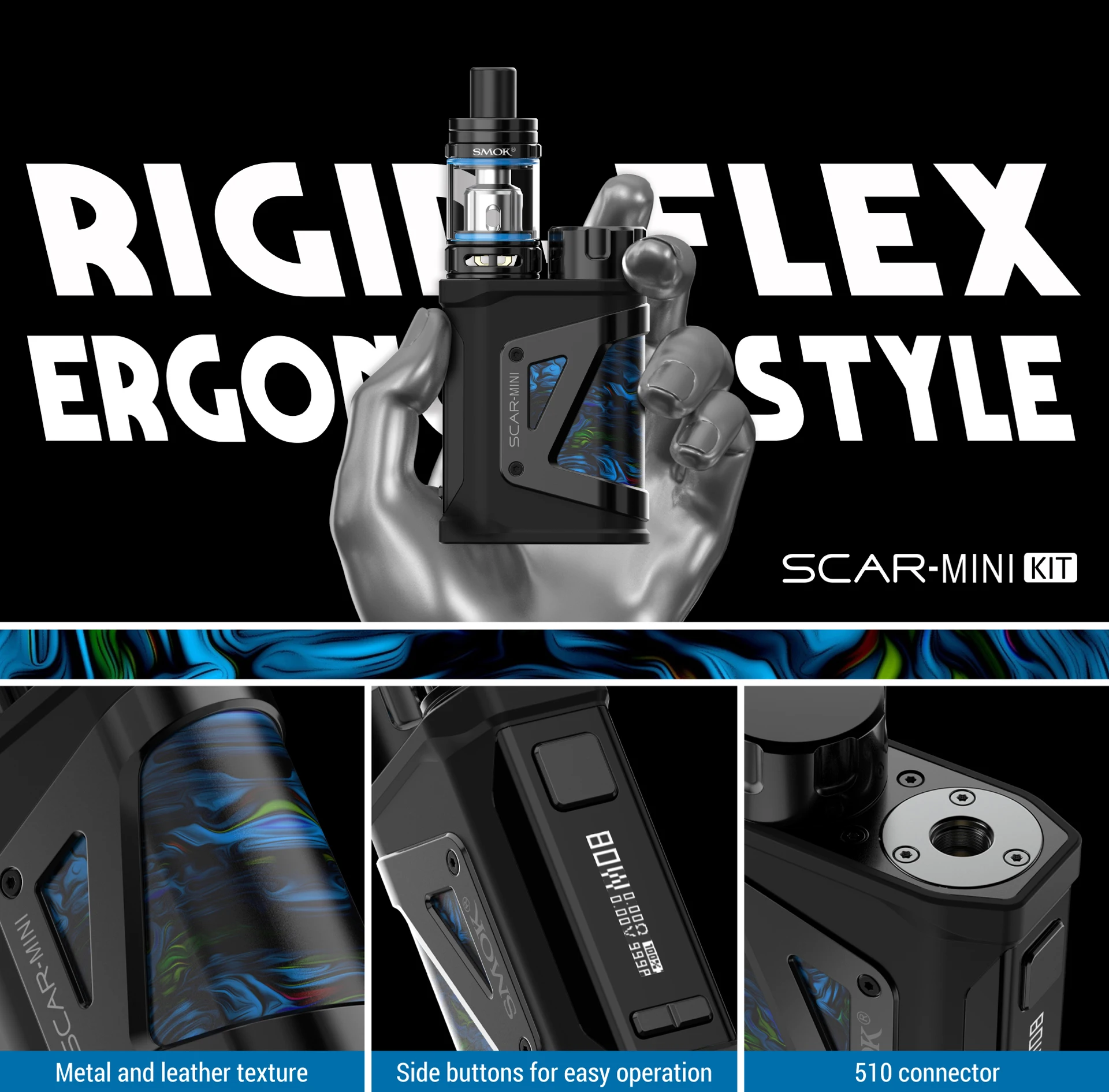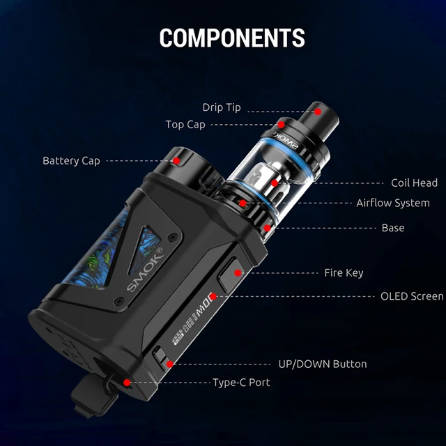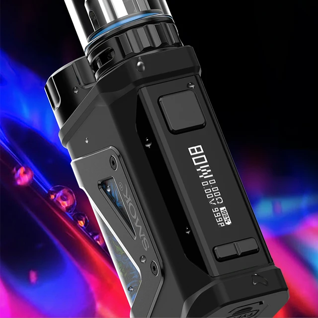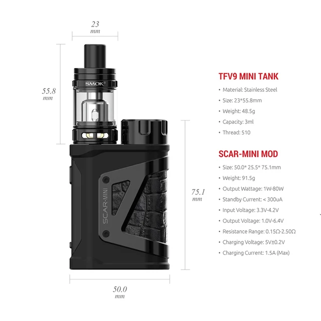 Scar Mini Kit se compose de Scar-Mini 80W Box Mod et tfv9. Le mod est fait de cuir et de métal pour montrer une fusion de délicatesse et de force et présente une taille modérée. Conçu avec un emplacement de batterie supérieur, une seule batterie externe 18650 peut être chargée facilement. Un écran OLED de 0.69 pouces affichera l’état de vapotage en temps réel pour vous. De plus, Scar Mini est étanche IP67, IP67 anti-poussière et antichoc, ce qui protégera très bien l’appareil. La conception de charge de Type C rend la charge simple et rapide. Le Mini réservoir TFV9 a une capacité de réservoir de 3ml et est livré avec un système de flux d’air réglable amélioré. Il y a un capuchon supérieur résistant aux enfants pour garder les enfants loin du réservoir et éviter l’ouverture accidentelle du capuchon supérieur. Deux bobines V9 maillées de 0,15 ohm sont incluses dans l’emballage. Le type de remplissage est facile à remplir.