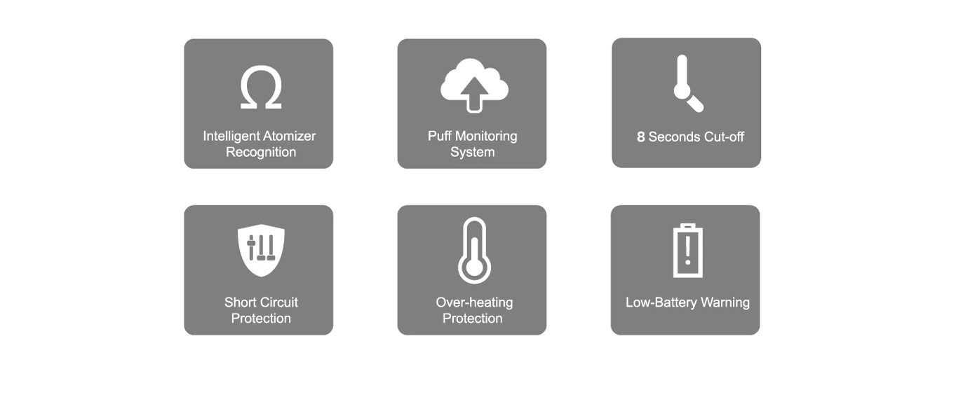 12. Protections multiples: atomiseur Intelligent/système de surveillance des bouffées/coupure 8S/court-Circuit/surchauffe/Protection d’avertissement de batterie faible