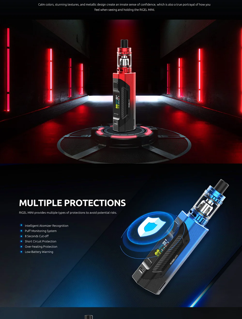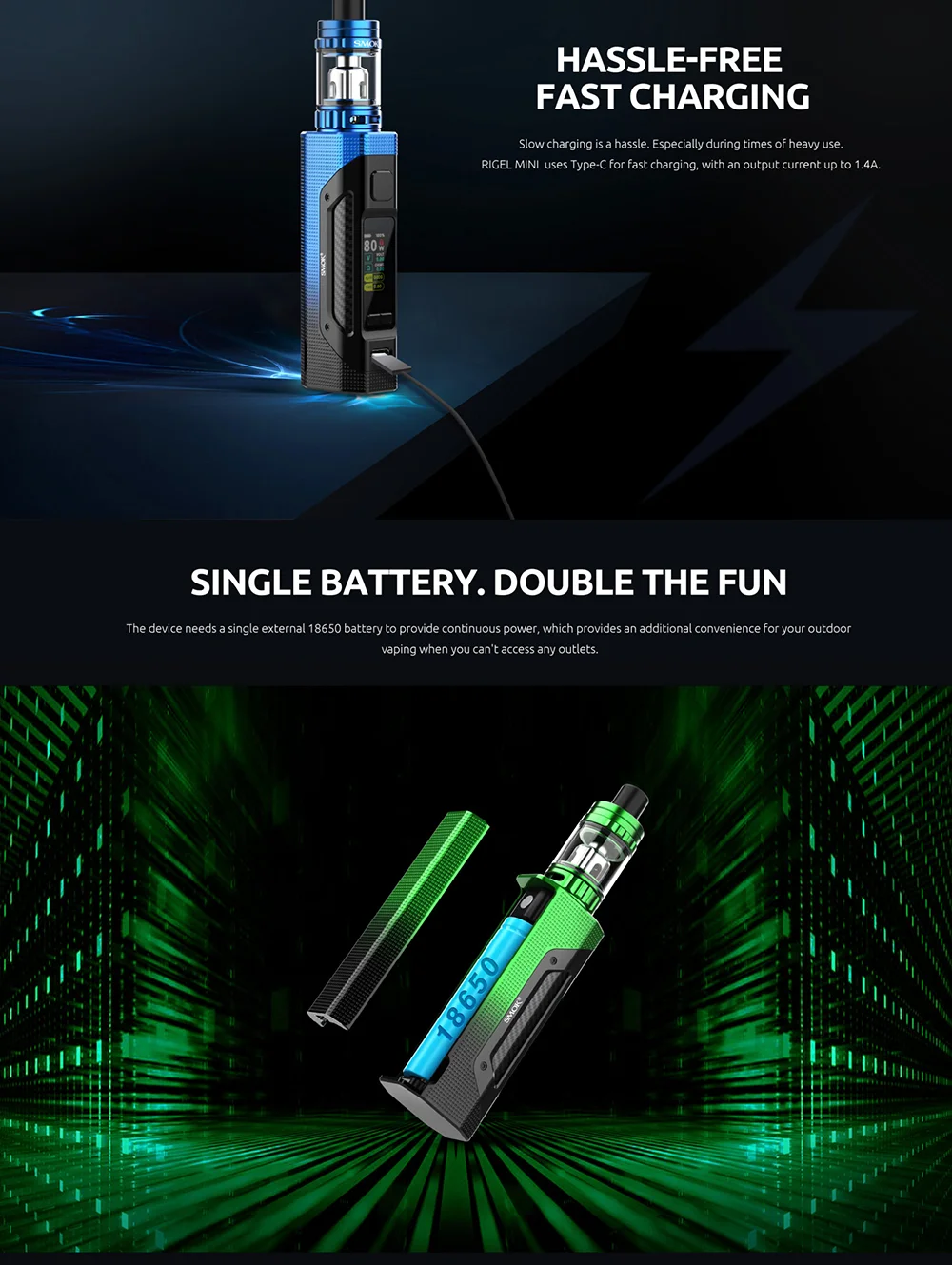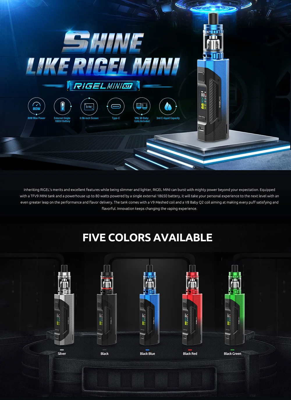 Héritant des mérite de RIGEL et des excellentes caractéristiques tout en étant plus mince et plus léger, RIGEL MINI peut éclater avec une puissance puissante au-delà de vos attentes. Équipé d’un MINI réservoir TFV9 et d’une centrale électrique jusqu’à 80 watts alimentée par une seule batterie externe 18650, il fera passer votre expérience personnelle à un niveau supérieur avec un saut encore plus important sur la performance et la livraison de saveur. Le réservoir est livré avec une bobine maillée V9 et une bobine V8 Baby Q2 visant à rendre chaque bouffée satisfaisante et parfumée. L’innovation ne cesse de changer l’expérience de vapotage.
