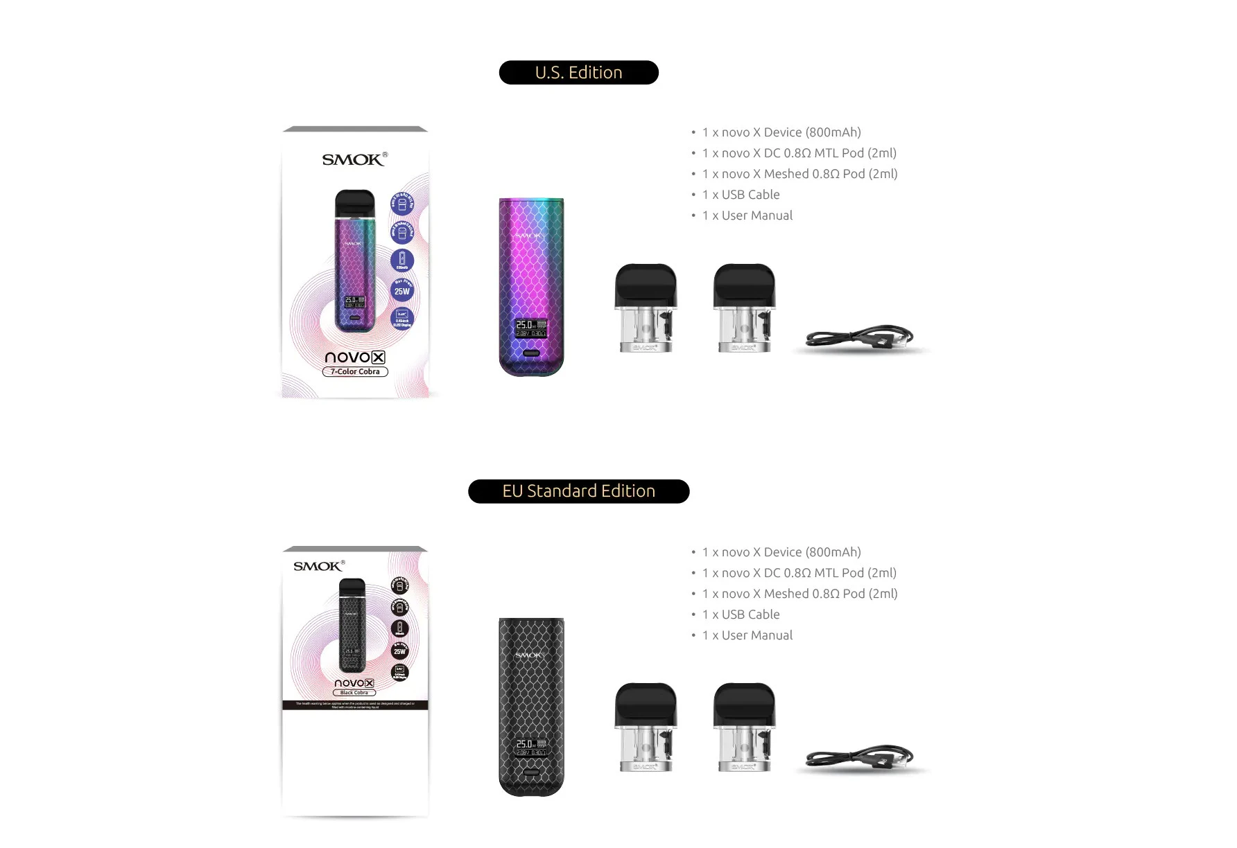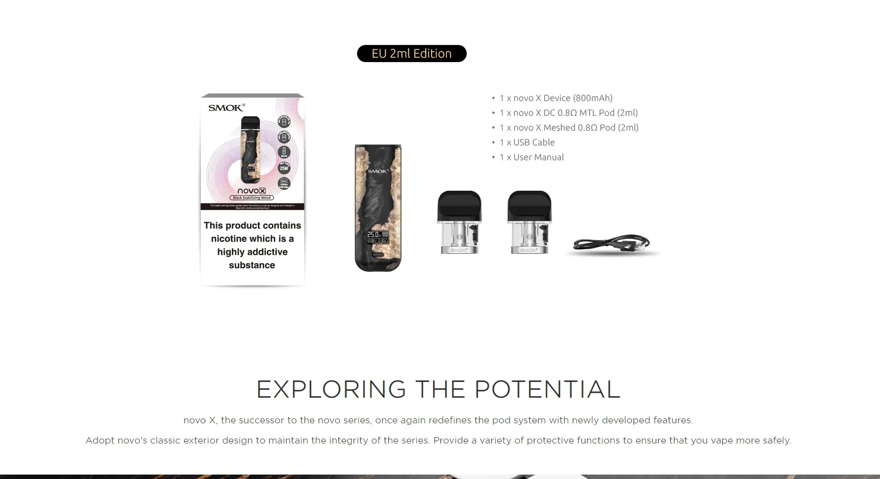 1 x appareil novo X (800mAh) 1 x novo X DC 0.80 MTL Pod (2ml) 1 x novo X mesh 0.80 Pod (2ml) 1 x câble USB 1 x manuel d’utilisation