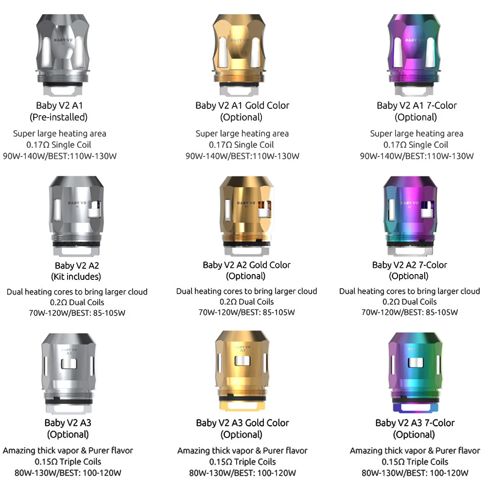 3p A2 7Color 0.2ohm3p A3 7Color 0.15ohm3p V2 Tank Glass 7ml3pcs A1 Gold 0.17ohm3pcs A1 SS 0.17ohm3pcs A2 Gold 0.2ohm3pcs A2 SS 0.2ohm3pcs A3 SS 0.15ohm3pcs K1 0.2ohm3pcs K4 0.15ohm3pcs S1 0.15ohm3pcs S2 0.15ohm