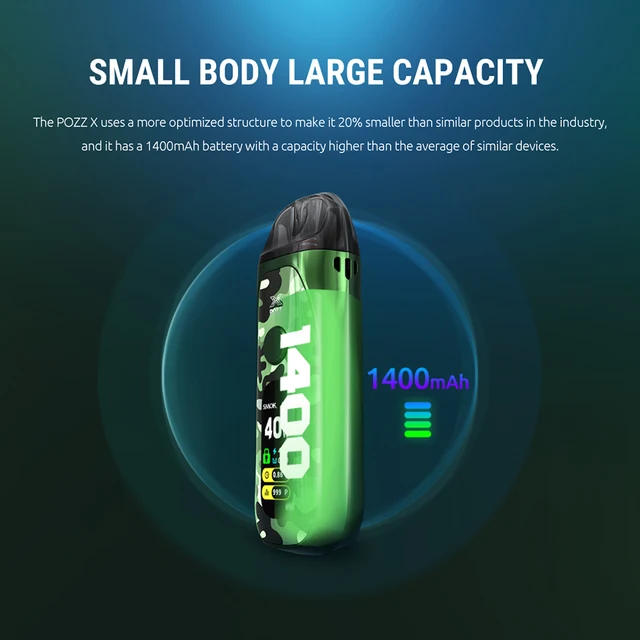La percée du système pod, l’amélioration de la puissance et des performances, et l’innovation de nouvelles possibilités sont maintenant prêtes à être découvertes. Voici POZZ X, un nouveau kit de système de pod avec une batterie puissante jusqu’à 1400mAh et une grande capacité d’e-liquide de 4.5ml.