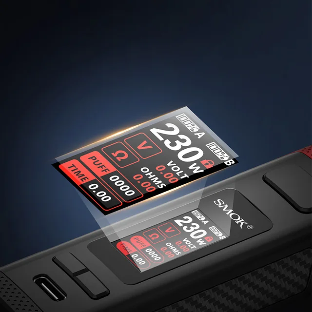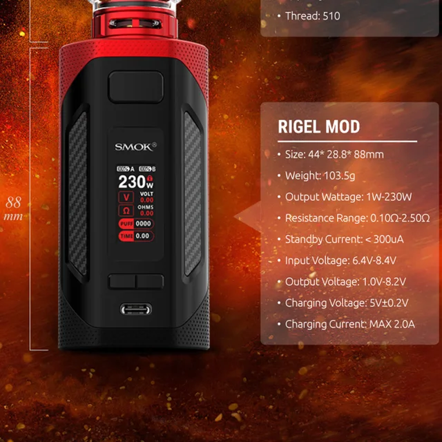 Rigel Mod est applicable au Kit SMOK Rigel et au réservoir tfv9. Il est conçu avec un revêtement en caoutchouc flexible et une conception latérale avec de la fibre de carbone classique, ce qui le rend lisse et résistant. Et il y a de nombreux trous en nid d’abeille éparpillés de manière ordonnée, apportant une sensation visuelle unique et une sensation de main confortable. Alimenté par deux batteries 18650, il peut tirer jusqu’à 230W de puissance de sortie maximale. De plus, il dispose d’une vitesse d’allumage de 0.001s avec son jeu de puces exceptionnel. En outre, il existe 6 interfaces utilisateur à thème pour votre option. Et l’écran couleur TFT de 0.96 pouces vous montrera les données de vape de base et simplifiera votre opération. De plus, il prend en charge USB type-c pour une alimentation fiable et une vitesse de transfert plus rapide et offre de multiples protections pour assurer votre santé et votre sécurité.