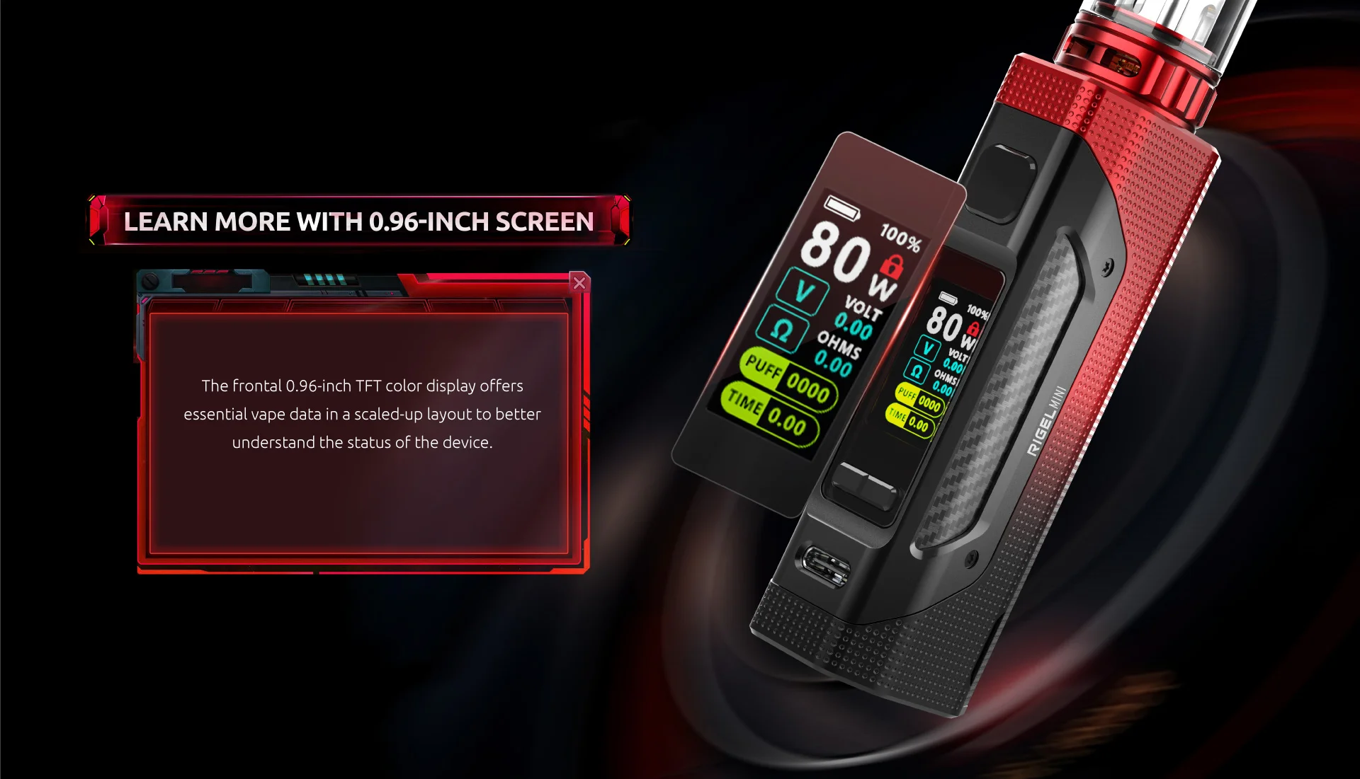 SMOK Rigel Mini Mod 80W est alimenté par une seule batterie 18650. Il est chargé par un port de charge rapide type-c. SMOK Rigel Mini Mod est équipé d’un écran couleur TFT de 0.96 pouces. Il dispose également d’une protection multiple pour protéger la fonction de vapotage mod.