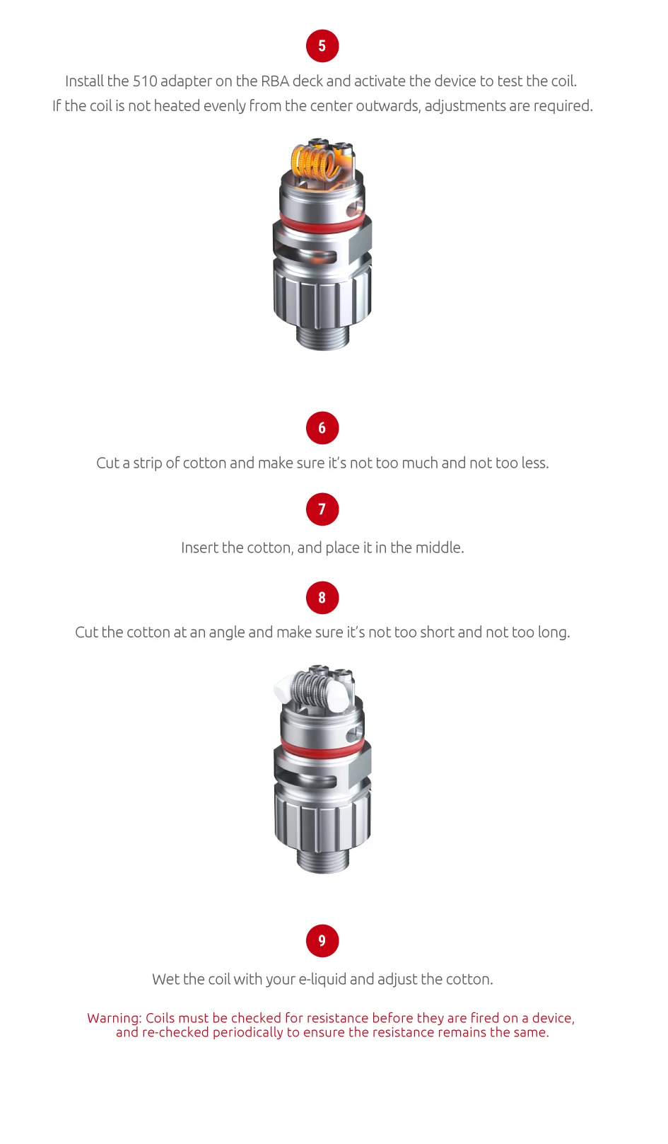 5. Bobine RPM RBA 0.6ohm:Profitez du plaisir du bricolage, apporte une saveur Intense et une vapeur de gradation, supporte les bobines avec une résistance minimale de 0.25 ohms