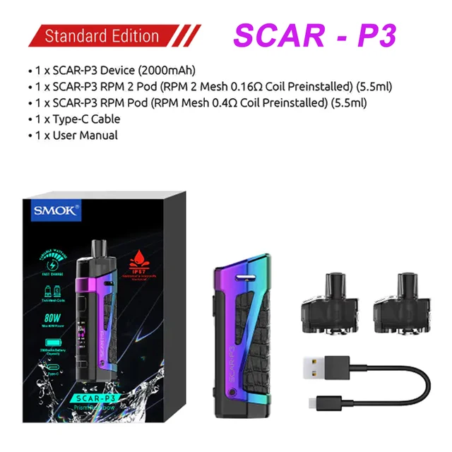 Distillant l’essence des mods de dosettes existants, la série SCAR est livrée avec deux options, SCAR-P3 et SCAR-P5, qui sont conçues pour être imperméables, antipoussière et antichocs, élever le mod pod à un tout nouveau niveau de performance et d’expérience utilisateur. Le kit est livré en standard avec deux dosettes et deux bobines: l’une est la dosette RPM 2 qui est conçue pour rechercher la meilleure saveur, et l’autre est le pod RPM qui est compatible avec toutes les bobines RPM. L’innovation ne cesse de changer l’expérience de vapotage.