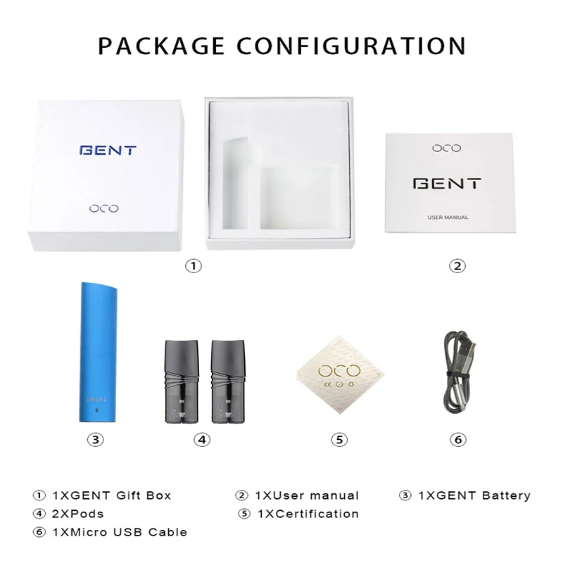 1 * coffret cadeau pour homme + 1 * batterie pour homme + 2 * dosettes (sans e-liquide) + 1 * manuel d’utilisation + Certification + 1 * câble Micro USB