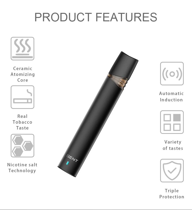 1. Noyau d’atomisation en céramique 2. Goût réel du tabac 3.Triple protection 4. induction automatique 5. Variété de goûts 6. Technologie du sel de Nicotine
