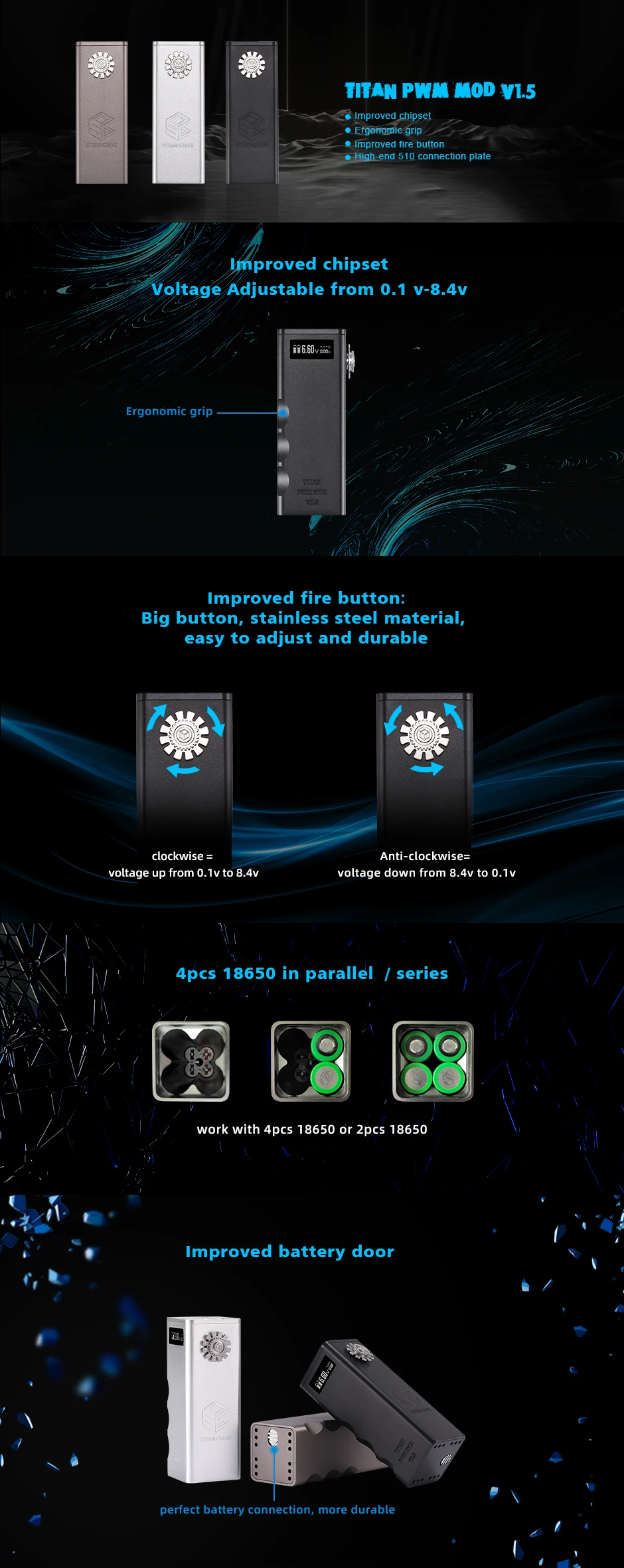 Titan PWM Mod V1.5 est un mod VV box qui se caractérise par une forte puissance, une prise ergonomique et un fonctionnement simple. Il est alimenté par des batteries 18650 doubles ou quad, qui peuvent tirer jusqu’à 300W de sortie max. Et surveillé par un jeu de puces amélioré, il vous permet de régler la tension de 0.1V à 8.4V via le bouton de feu durable. De plus, il adopte une porte de batterie améliorée pour une connexion parfaite de la batterie. De plus, avec une plaque de connexion 510 haut de gamme, il est compatible avec plus de réservoirs. Il suffit d’en avoir un pour commencer un nouveau voyage!