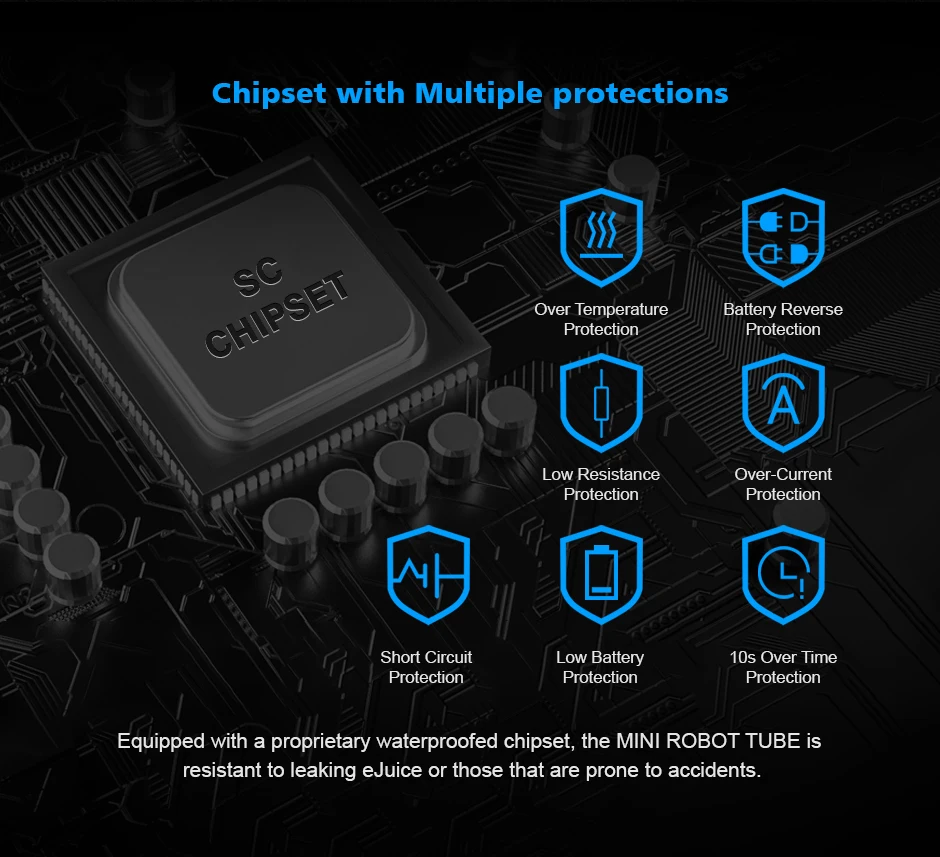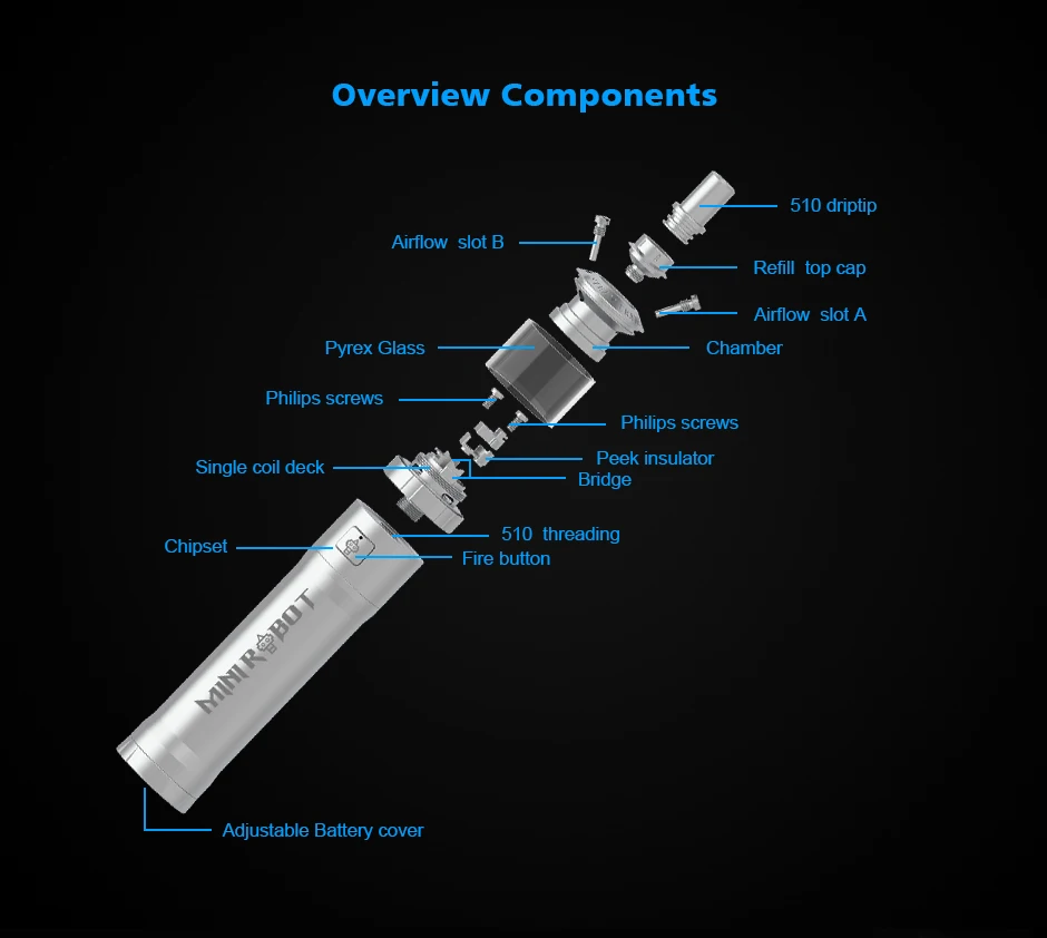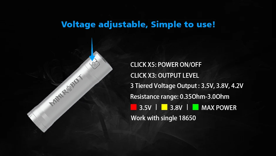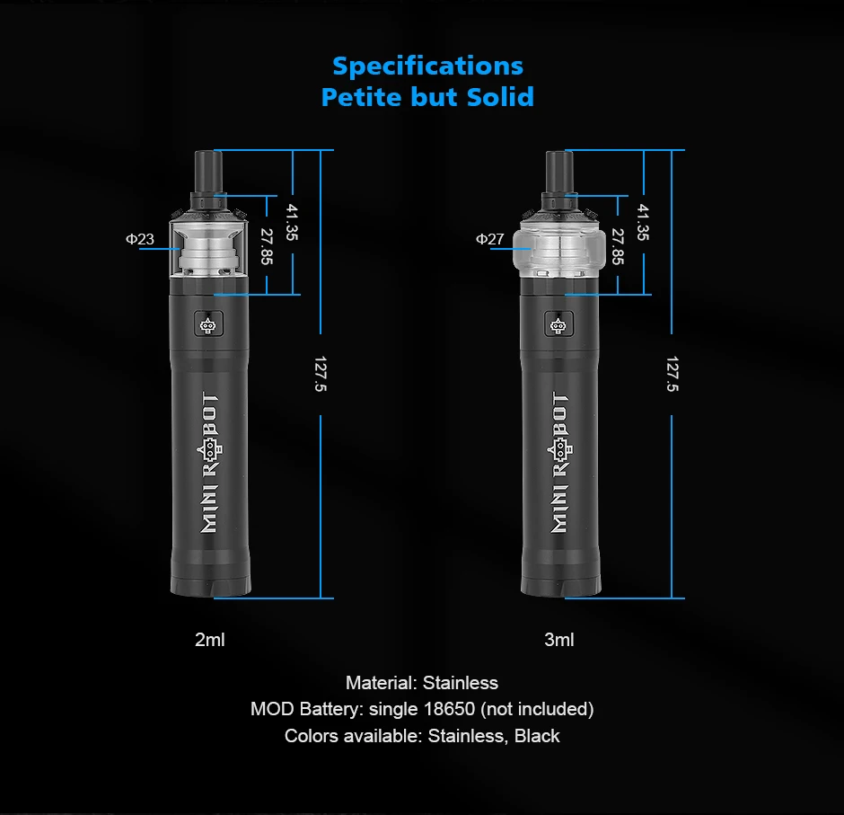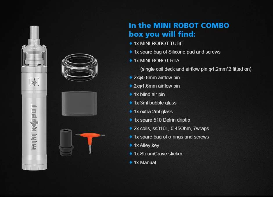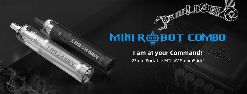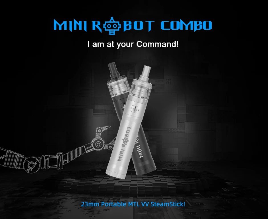 Mini Robot Combo Kit est un kit MTL VV portable de 23mm. Il peut fonctionner avec une seule batterie 18650, prend en charge 3 sorties réglables: 3.5V, 3.8V et 4.2V max. L’ensemble du kit est fabriqué en acier inoxydable complet, livré avec un artisanat de gravure et de corrosion, ce qui rend le Combo Mini Robot plus exquis. Il est équipé d’un jeu de puces étanche exclusif pour protéger le Mini Robot Combo contre les fuites d’e-jus ou ceux qui sont sujets à des accidents. Mini Robot Combo est emballé avec Mini Robot RTA de 3ml/2ml. Avec un seul pont de bobine, un flux d’air supérieur et des conceptions de remplissage supérieur, il vous offrira une expérience de vapotage facile et satisfaisante. De plus, différentes broches à air sont disponibles pour que vous puissiez choisir de profiter de différentes saveurs.