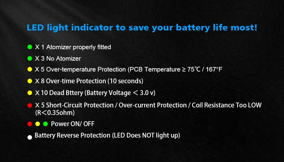 9. protection Multiple: surchauffe/inversion de batterie/faible résistance/surintensité/court-Circuit/batterie faible/Protection de 10s au fil du temps