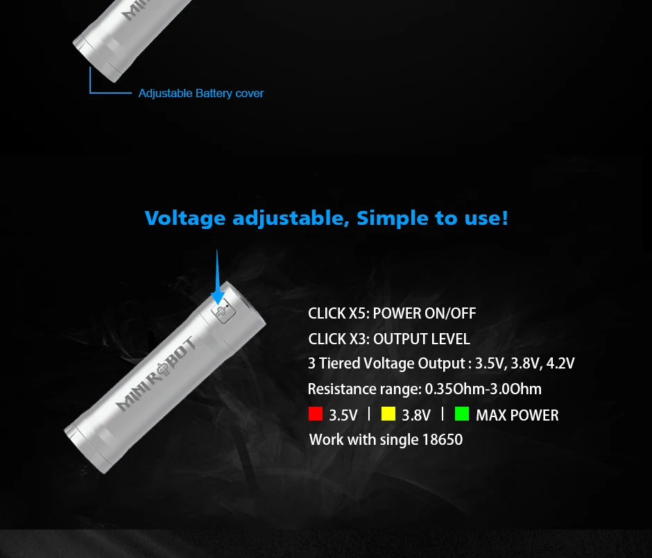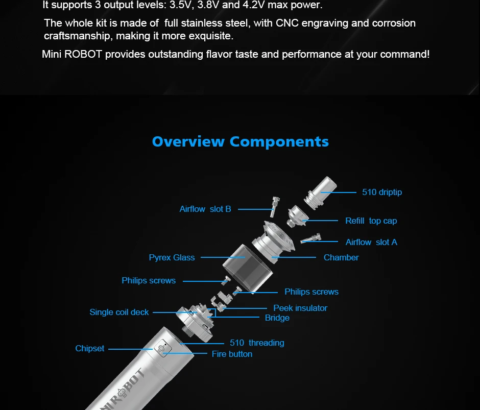 Vapeur EnvieMini Robot Combo Kit est un kit MTL VV portable de 23mm. Il peut fonctionner avec une seule batterie 18650, prend en charge 3 sorties réglables: 3.5V, 3.8V et 4.2V max. L’ensemble du kit est fabriqué en acier inoxydable complet, livré avec un artisanat de gravure et de corrosion, ce qui rend le Combo Mini Robot plus exquis. Il est équipé d’un jeu de puces étanche exclusif pour protéger le Mini Robot Combo contre les fuites d’e-jus ou ceux qui sont sujets à des accidents. Mini Robot Combo est emballé avec Mini Robot RTA de 3ml/2ml. Avec un seul pont de bobine, un flux d’air supérieur et des conceptions de remplissage supérieur, il vous offrira une expérience de vapotage facile et satisfaisante. De plus, différentes broches à air sont disponibles pour que vous puissiez choisir de profiter de différentes saveurs.
