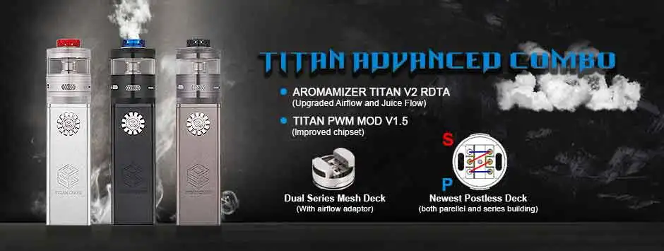 Titan Advanced Combo Kit est combiné avec Titan PWM V1.5 Mod et Titan V2 RDTA. Le Titan PWM V1.5 Mod adopte une conception ergonomique, se caractérise par une forte puissance et un fonctionnement simple. Il est alimenté par des batteries 18650 doubles ou quad, qui peuvent tirer jusqu’à 300W de sortie max. Et surveillé par un jeu de puces amélioré, il vous permet de régler la tension de 0.1V à 8.4V via le bouton de tir durable. Titan PWM V1.5 Mod adopte une porte de batterie améliorée et une plaque de connexion haut de gamme 510, son écran OLED de 0.58 pouces affiche clairement les données de vapotage, vous apporte plus de commodité. L’atomiseur de réservoir reconstructible colossal-Titan V2 RDTA peut contenir une capacité de 32ml/20ml (le verre à bulles de remplacement est inclus dans l’emballage). Doté d’une conception de remplissage supérieure pratique à 360 degrés, il est pratique et sans gaspillage. Avec le système de contrôle du débit d’air et de jus, il peut fournir des nuages denses et un goût savoureux en modes RTA et RDA. De plus, l’aromiseur Steam Crave Titan V2 RDTA utilise un pont sans poste innovant pour construire une double bobine parallèle et série. Obtenez Steam Crave Titan Advanced Combo Kit pour plus de plaisir!