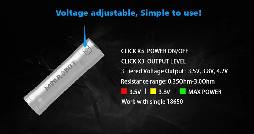 Le Mini Tube Robot peut fonctionner avec une seule batterie 18650, supporte 3 sorties réglables: 3.5V, 3.8V et 4.2V max. Il est fabriqué en acier inoxydable complet, livré avec un artisanat de gravure et de corrosion, ce qui rend le Combo Mini Robot plus exquis. Il est équipé d’un jeu de puces étanche exclusif pour protéger le Mini Robot Combo contre les fuites d’e-jus ou ceux qui sont sujets à des accidents.