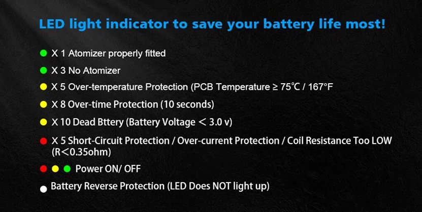 6. protection Multiple: surchauffe/inversion de batterie/faible résistance/surintensité/court-Circuit/batterie faible/Protection de 10s au fil du temps