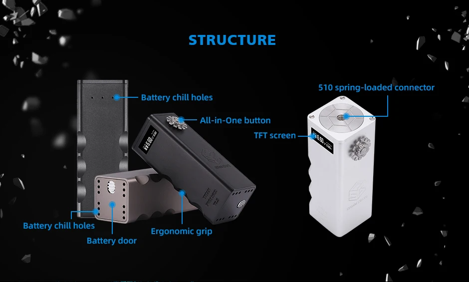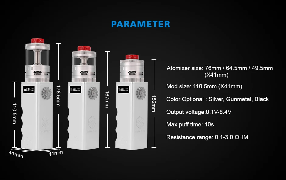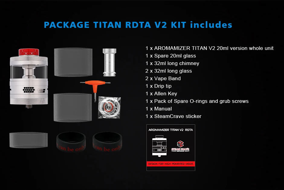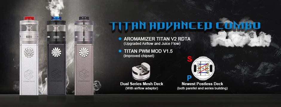 Steam Crave – Kit de Mod Titan PWM comprenant Titan PWM MOD V1.5, aromamiseur Titan V2 RDTA et Titan dual series mesh deck. Titan PWM V1.5 Mod est alimenté par 4*18650 batteries. Le Steam Crave Titan PWM MOD V1.5 a amélioré le jeu de puces et le bouton de tir, qui peut être réglé de 0.1 à 8.4V et facile à régler le bouton de tir. L’aromiseur Titan V2 RDTA adopte le dernier pont sans poste pour la construction parallèle et en série. Il supporte le remplissage par le haut.