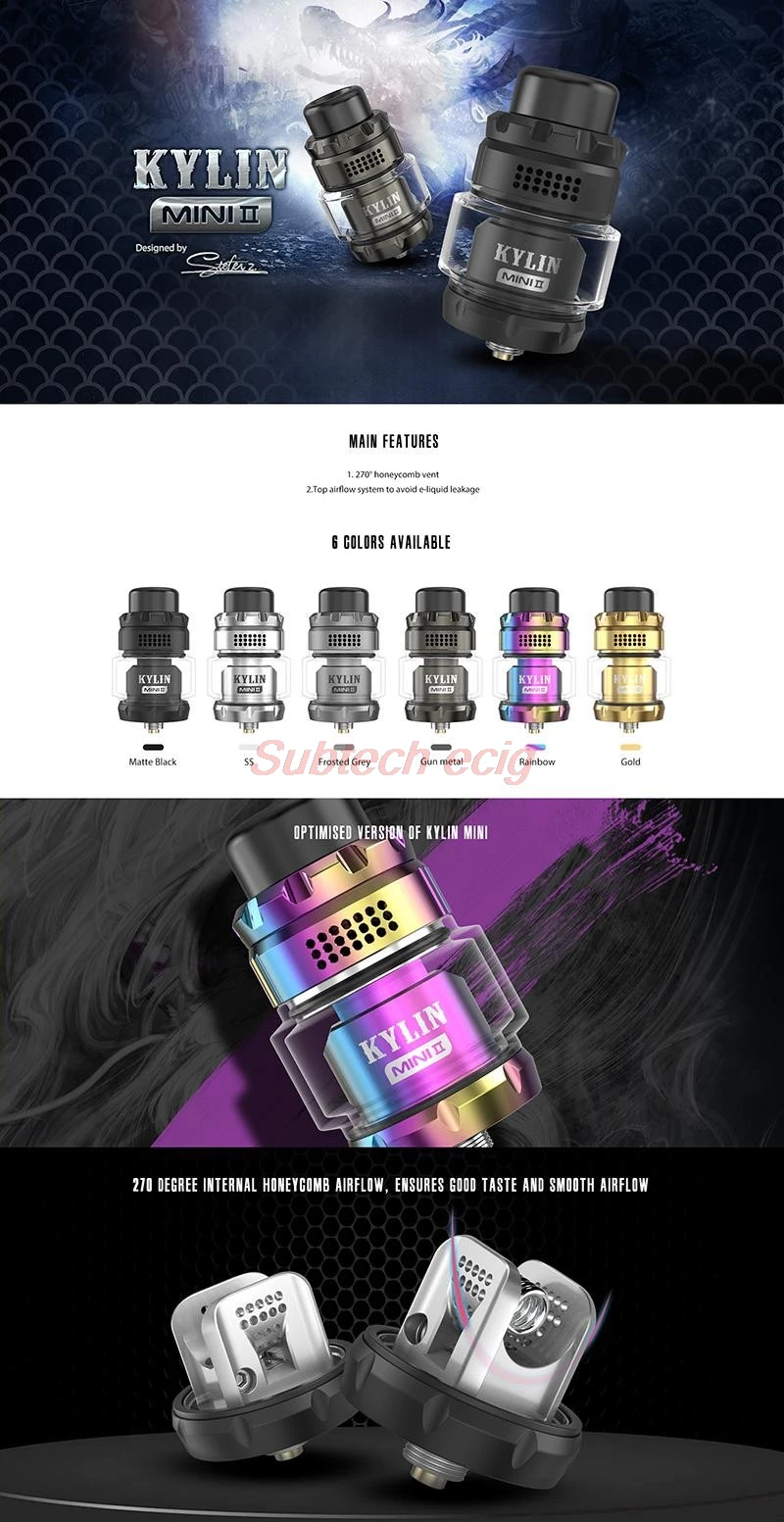 The Kylin Mini V2 RTA has various 2ml/5ml capacity with 24.4mm diameter, and supports single coil building. It features the top airflow design which can prevent juice from leaking and also features the 270 degree internal honeycomb airflow which makes the airflow smooth and brings you good taste.