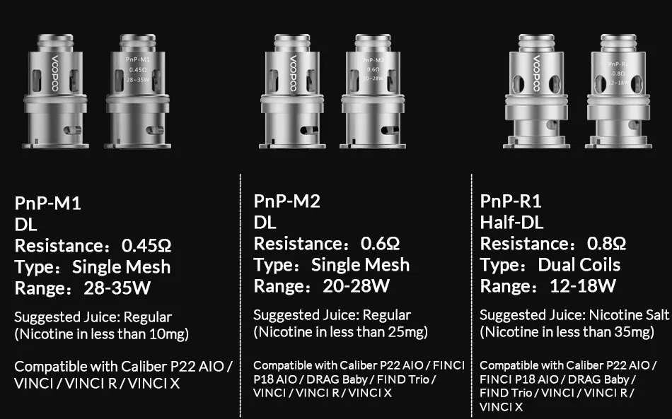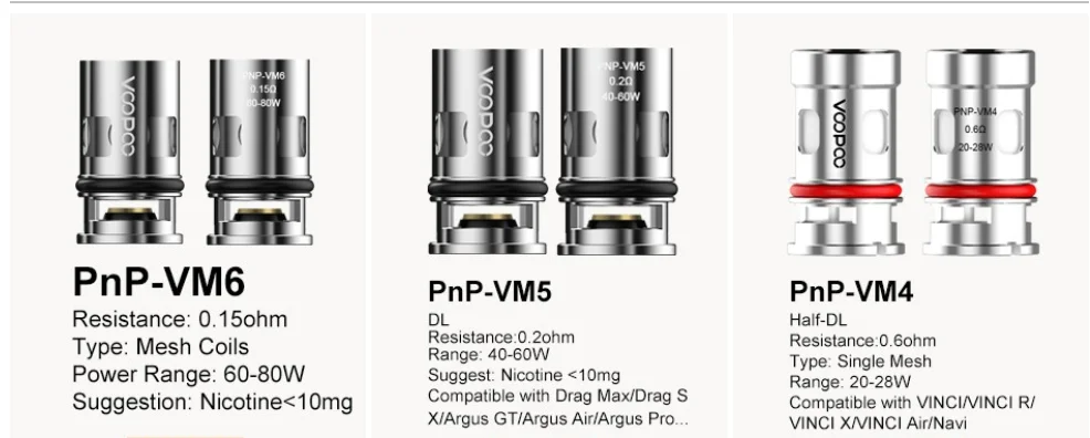 La tête de bobine VOOPOO PnP est conçue pour les produits de la série VOOPOO VINCI / Drag / Argus, VOOPOO Navi et VOOPOO Find S Trio Kit. Il dispose de 8 types de spécifications, 0.3ohm PnP-VM1, 0.45ohm PnP-VM3, 0.6ohm PnP-VM4, 0.2ohm PnP-VM5, 0.15ohm PnP-VM6, 0.6ohm PnP-M2, 0.8ohm PnP-R1 et 1.0ohm PnP-R2, qui répondra facilement à vos différents besoins de vapotage. Chaque paquet contient 5 bobines.