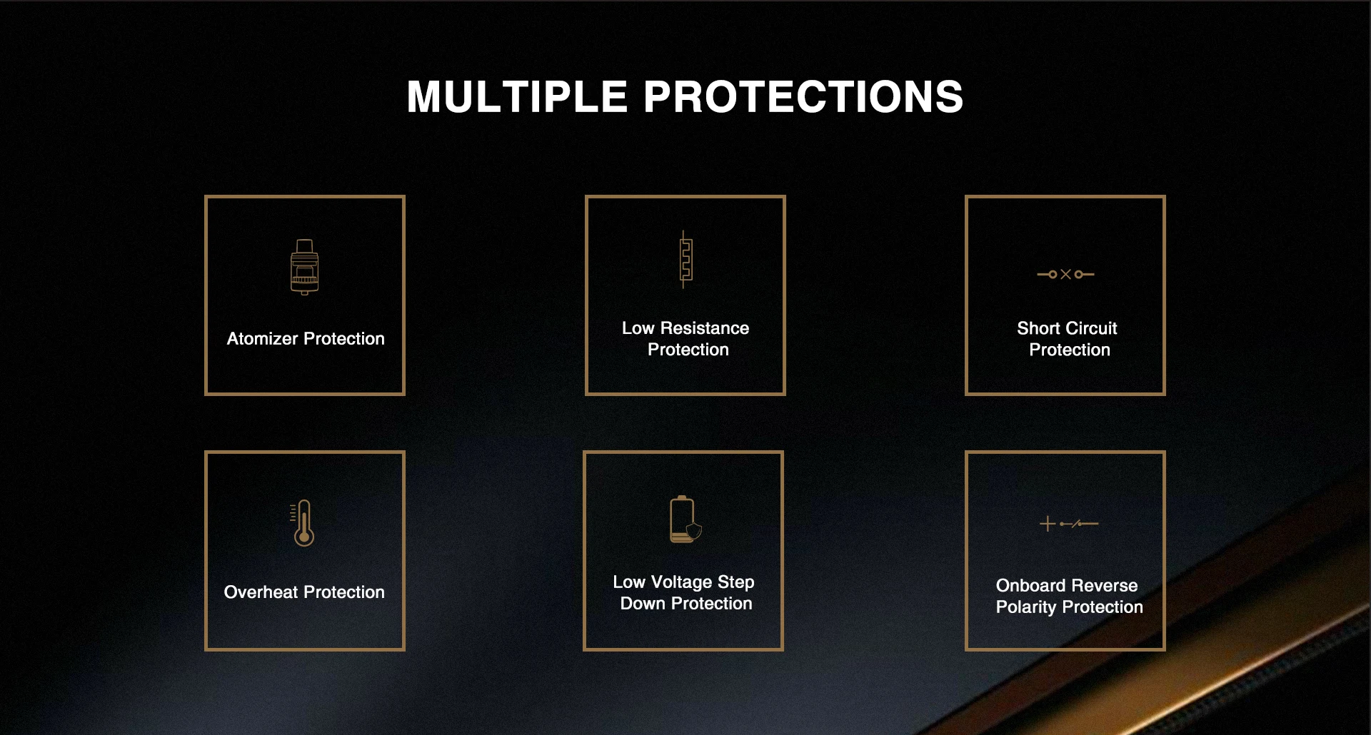 11. Protections multiples: atomiseur/faible résistance/court-Circuit/surchauffe/basse tension abaisseur/Protection intégrée contre l’inversion de polarité
