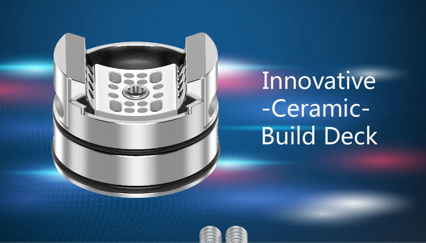 Tauren Max RDA est adapté pour BF Pin Mod. C’est un goutteur reconstructible à double bobine de 25mm de diamètre avec un pont en céramique sans poteau. Le pont de construction à double poteau permet un remplacement facile de la bobine grâce au système de double pince en céramique. Il y a 26 trous d’air de trois côtés. De plus, le nid d’abeille 3D offre une excellente saveur et un fort coup à la gorge.