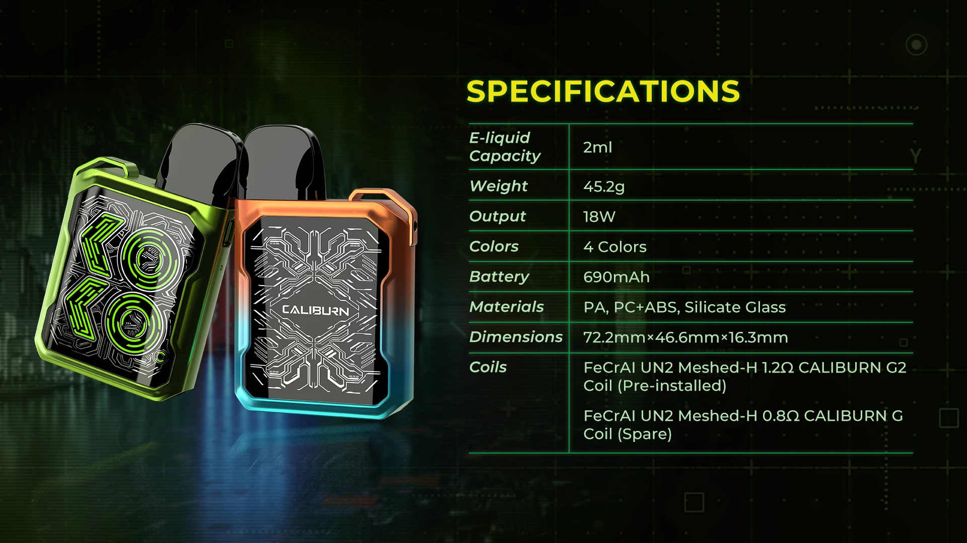 | Coil 1 | FeCrAl UN2 Meshed-H 1.2Ω Coil CALIBURN G2 Coil (Pre-installed) |