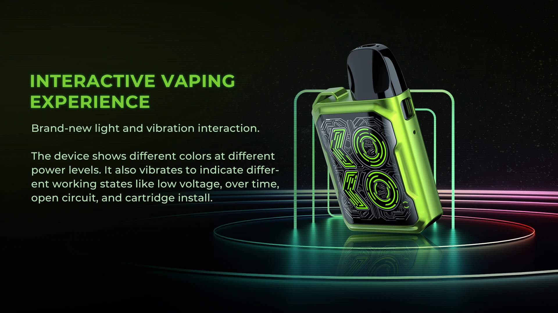Les fonctions de lumière et de vibration offrent de nouvelles façons de communiquer avec les vapeurs. La lumière brille de différentes couleurs à différents niveaux de puissance. Et l’appareil vibre dans différents états. Grâce aux deux designs, les vapeurs auront une meilleure expérience interactive.